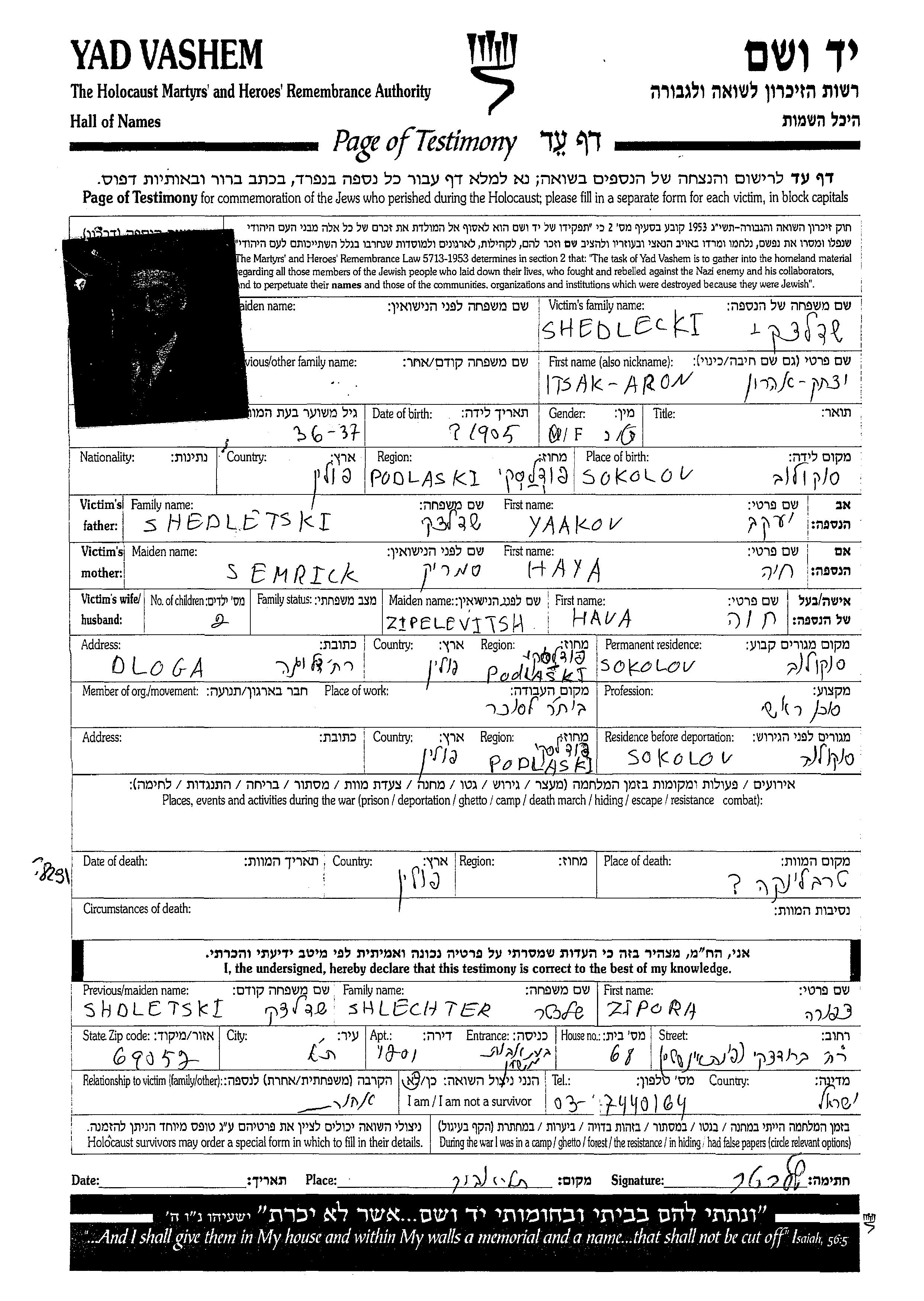 Itsak Aron Shedlecki wurde im Jahr 1905 in Sokolow, Polen geboren. Er war סוכן ראש. Vor dem Zweiten Weltkrieg lebte er in Sokolow, Polen.