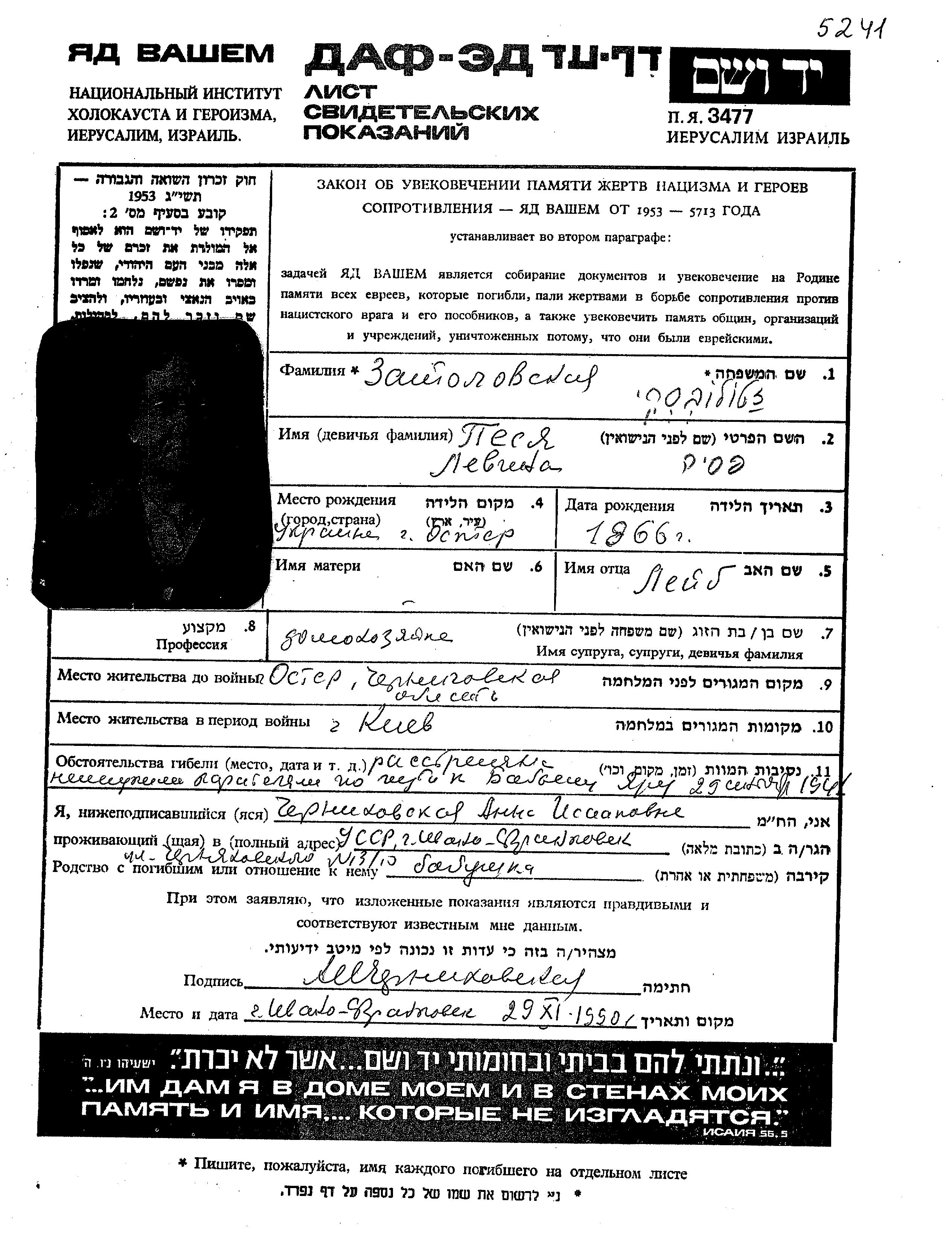 Pesia Zatolovsky, geb. Levin wurde im Jahr 1866 in Oster, Ukraine (UdSSR) geboren. Sie war Hausfrau. Vor dem Zweiten Weltkrieg lebte sie in Oster, Ukraine (UdSSR).