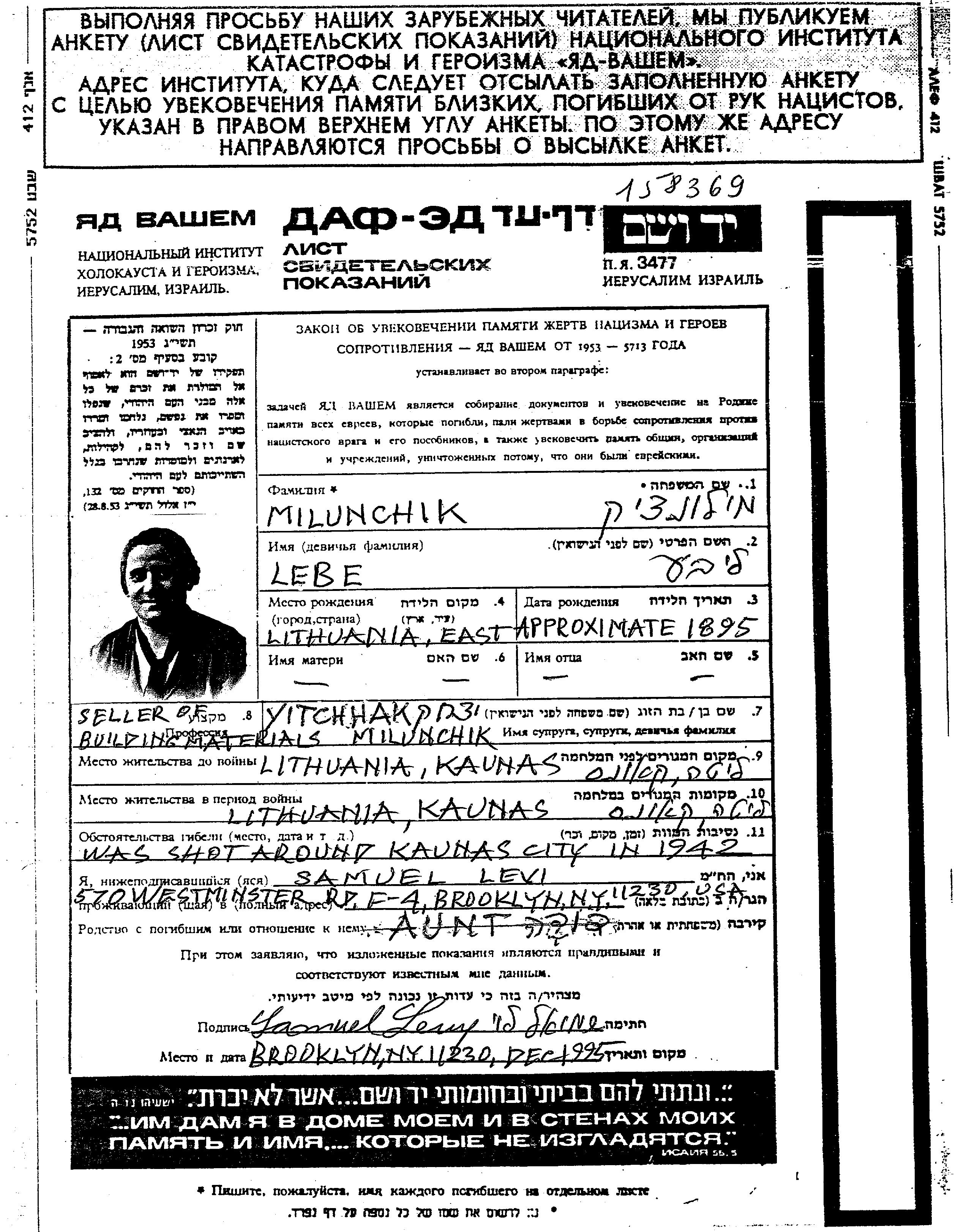 Lebe Liba Milunchik wurde im Jahr 1895 in Litauen geboren. Sie war Verkäufer/-in. Vor dem Zweiten Weltkrieg lebte sie in Kaunas, Litauen.