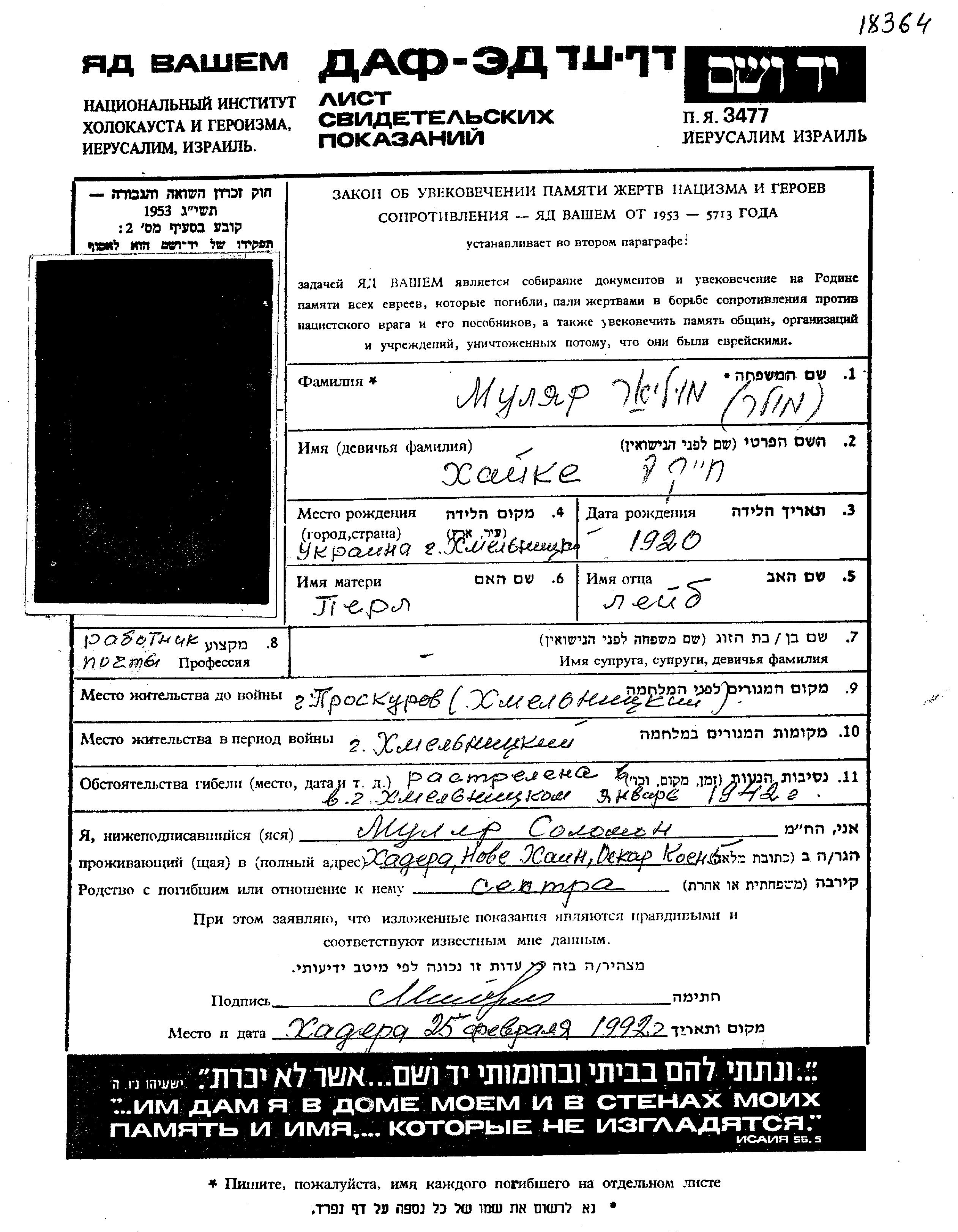 Khaike Mulyar wurde im Jahr 1920 in Proskurov, Ukraine (UdSSR) geboren. Sie war Postbote. Vor dem Zweiten Weltkrieg lebte sie in Proskurov, Ukraine (UdSSR).
