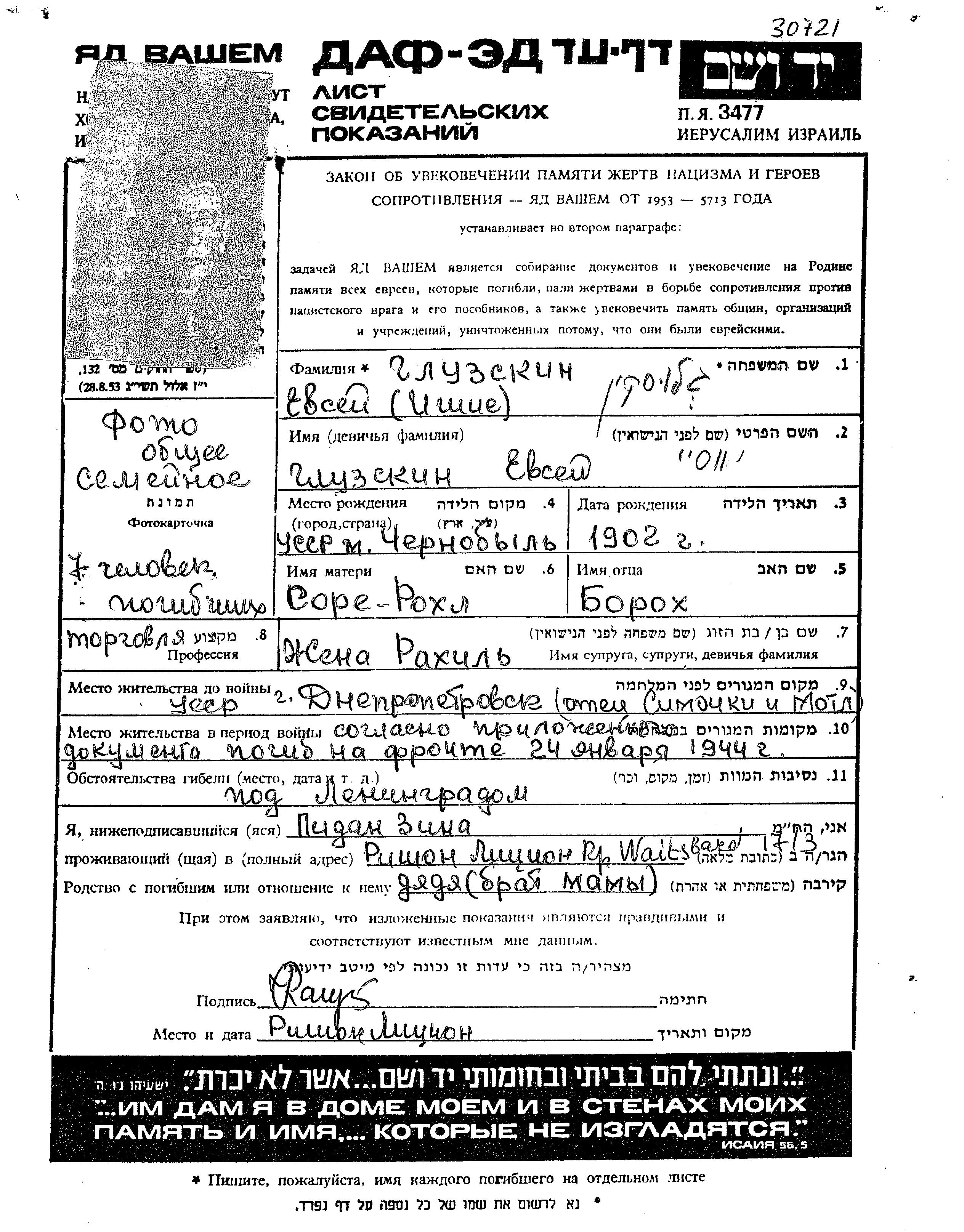 Yevsei Ishaia Gluzskin wurde im Jahr 1902 in Chernobyl, Ukraine (UdSSR) geboren. Er war Verkäufer/-in. Vor dem Zweiten Weltkrieg lebte er in Dnepropetrovsk, Ukraine (UdSSR).