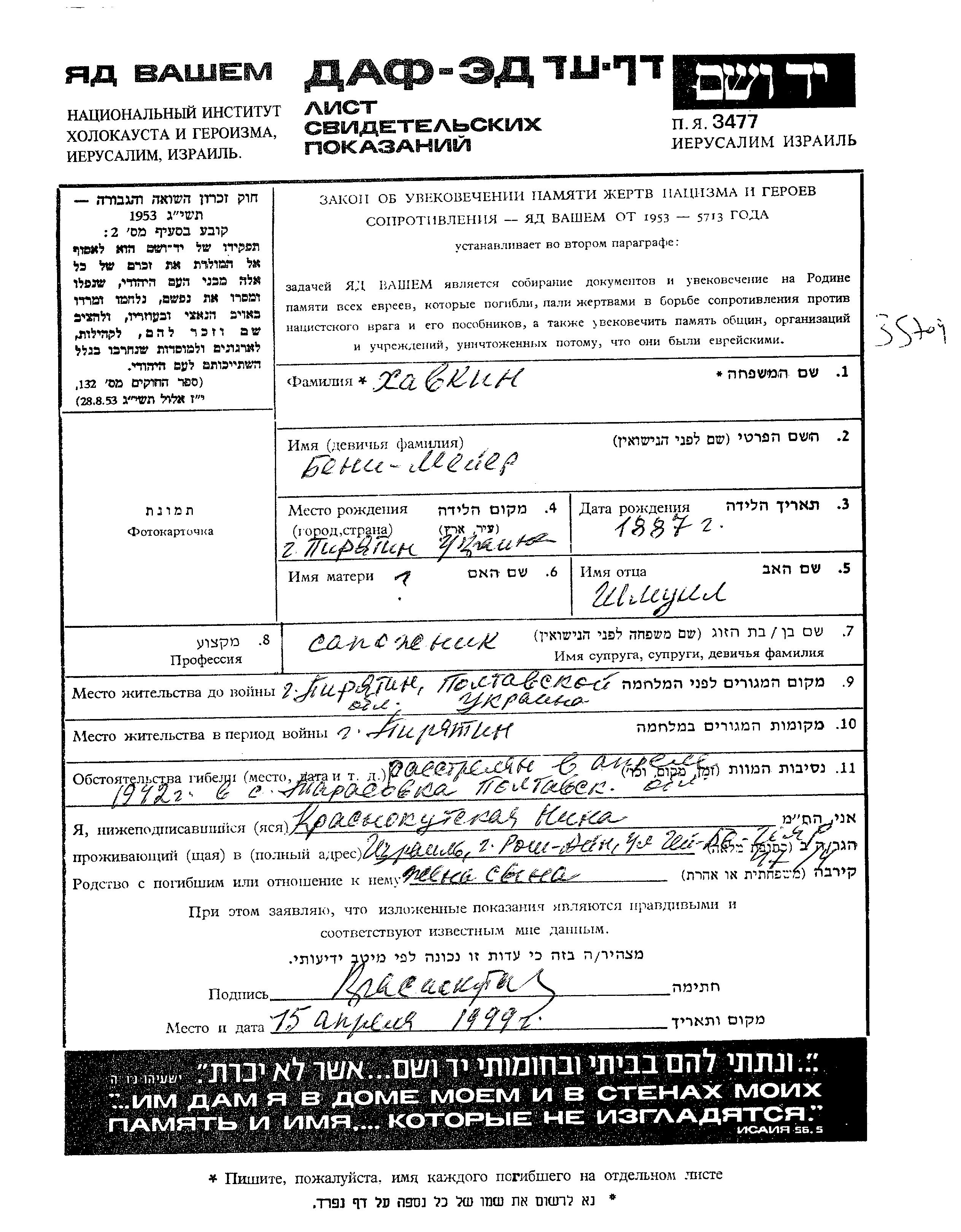 Beni Meyer Khavkin wurde im Jahr 1887 in Piryatin, Ukraine (UdSSR) geboren. Er war Schuster/-in. Vor dem Zweiten Weltkrieg lebte er in Piryatin, Ukraine (UdSSR).