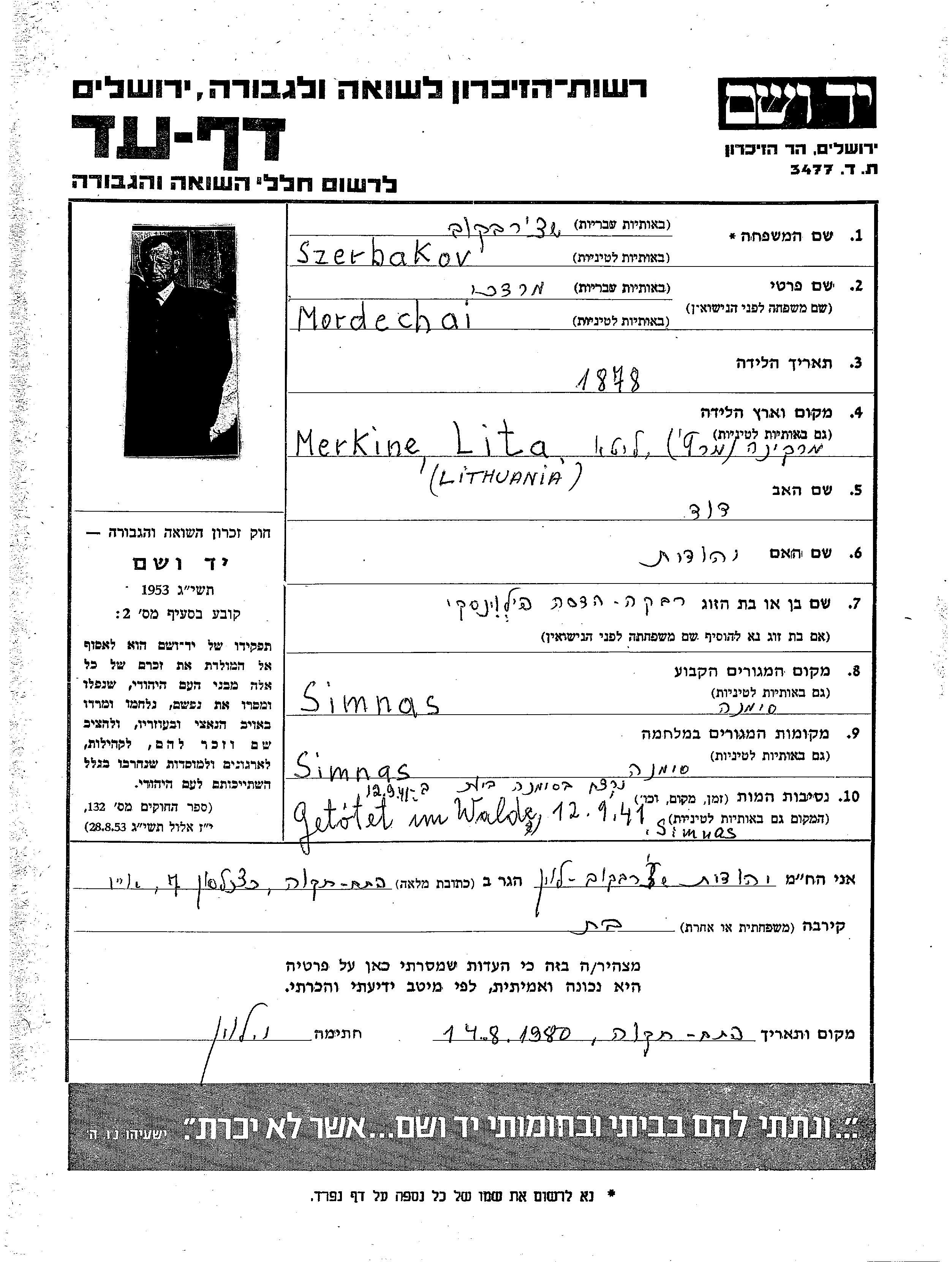 Mordechai Szerbakov wurde im Jahr 1878 in Merkine, Litauen geboren. Vor dem Zweiten Weltkrieg lebte er in Simnas, Litauen.