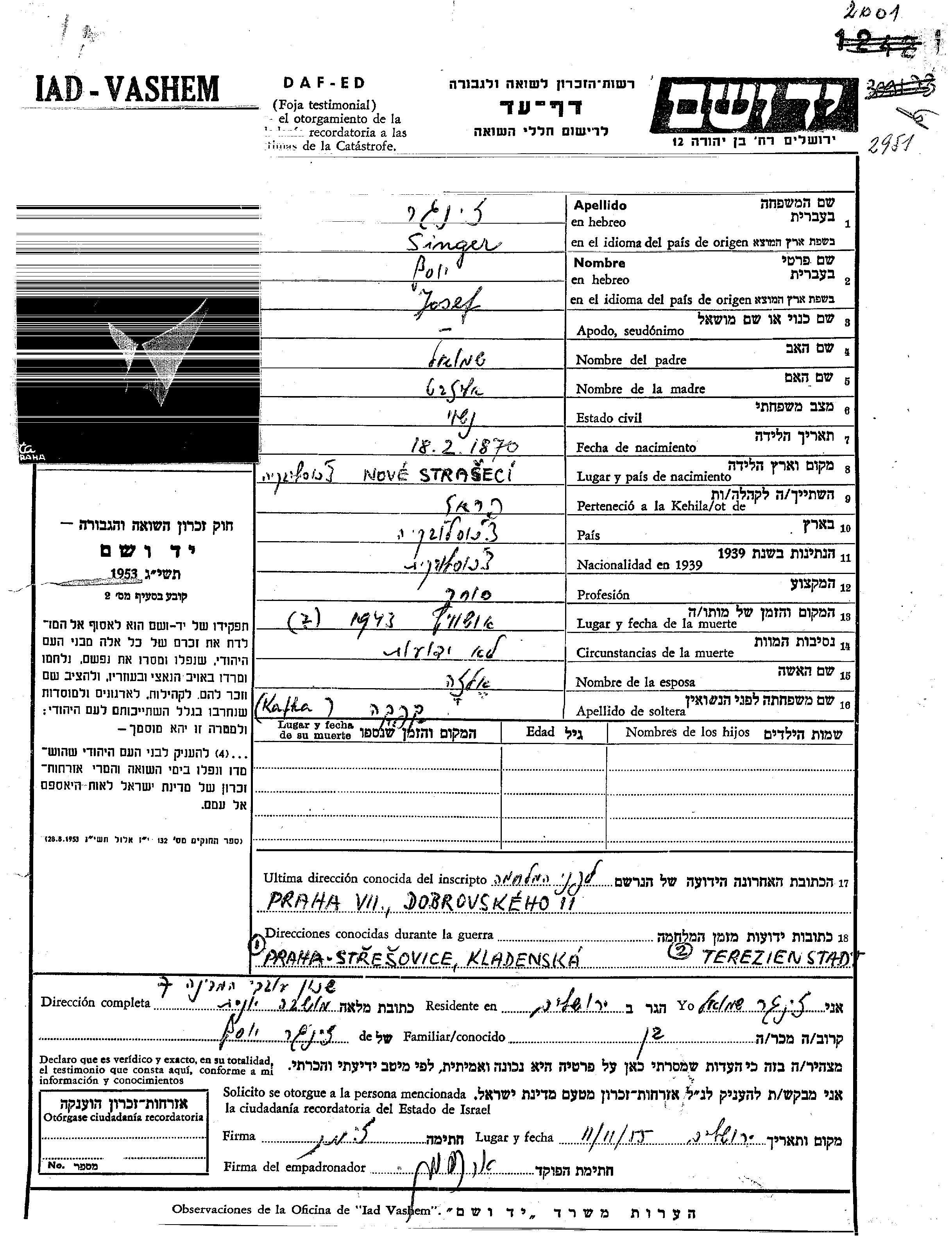 Yosef Singer Enger wurde im Jahr 1870 in Nove Straseci, Tschechoslowakei geboren. Er war Kaufmann/-frau. Vor dem Zweiten Weltkrieg lebte er in Praha, Tschechoslowakei.