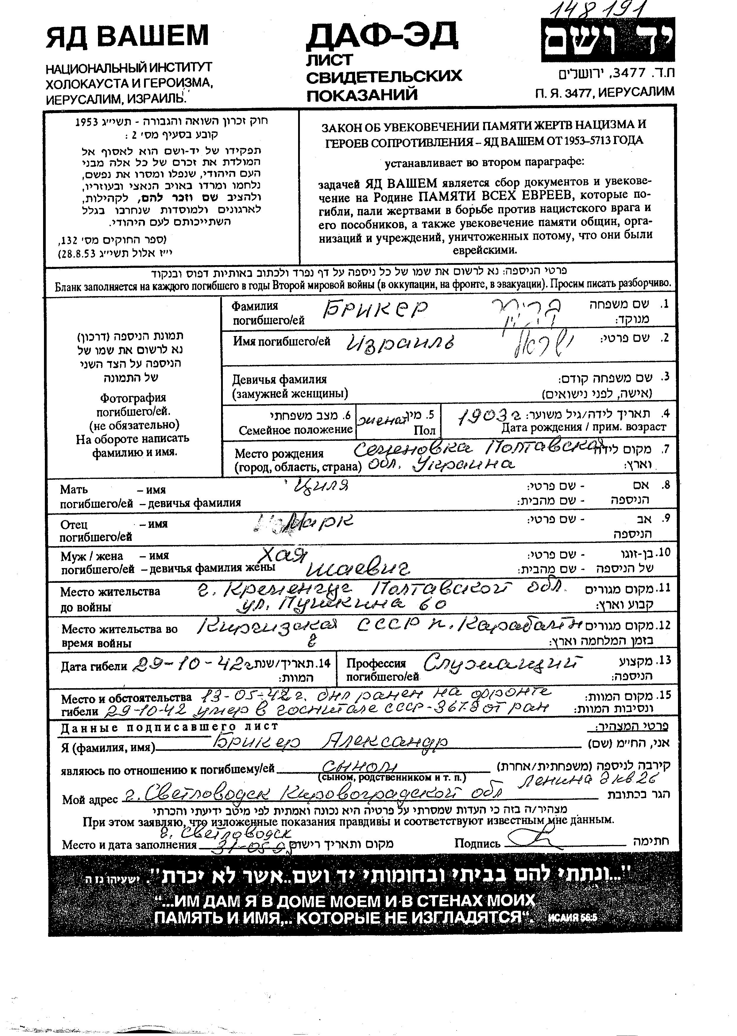 Izrail Briker wurde im Jahr 1903 in Semenovka, Ukraine (UdSSR) geboren. Er war Angestellte/-r. Vor dem Zweiten Weltkrieg lebte er in Kremenchug, Ukraine (UdSSR).