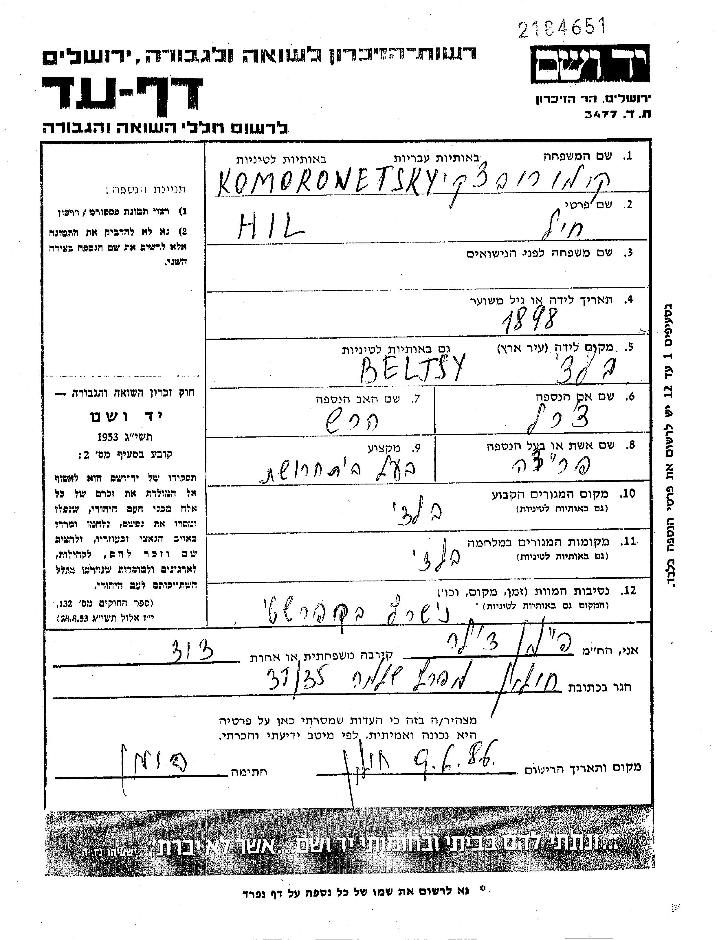 Yekhiel Komorovetsky wurde im Jahr 1898 in Balti, Rumänien geboren. Er war der Sohn von Hersh und Tzirl. Er war Fabrikant/-in und mit Frida Verheiratet. Vor dem Zweiten Weltkrieg lebte er in Balti, Rumänien. Während des Krieges war er in Balti, Rumänien.