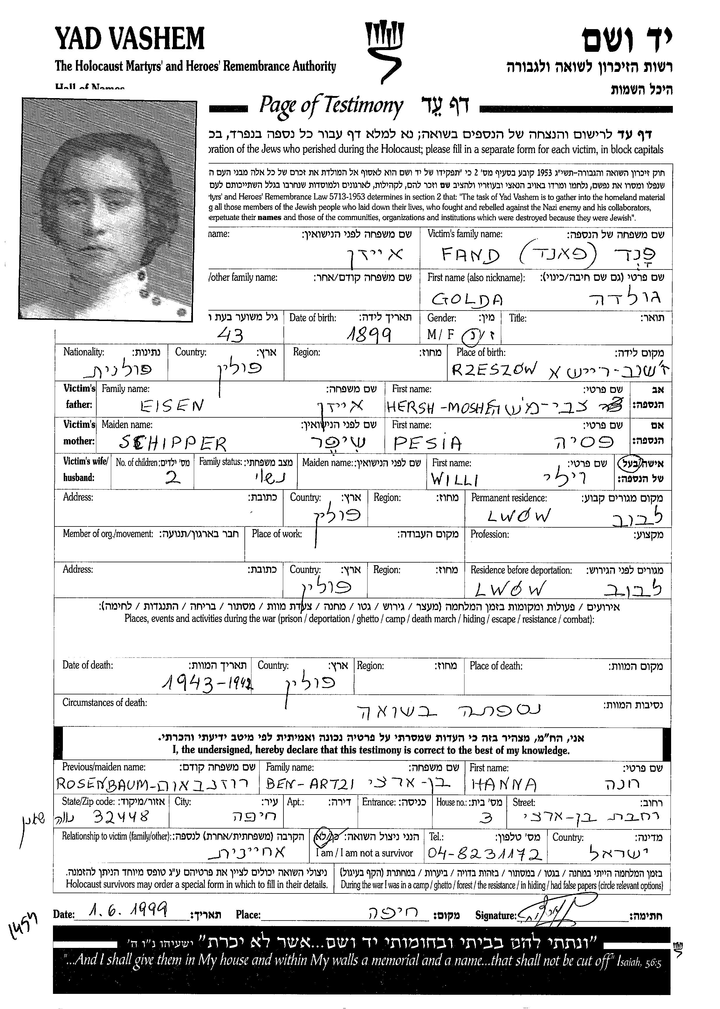 Golda Fand, geb. Eizen wurde im Jahr 1899 in Rzeszow, Polen geboren. Vor dem Zweiten Weltkrieg lebte sie in Lwow, Polen.