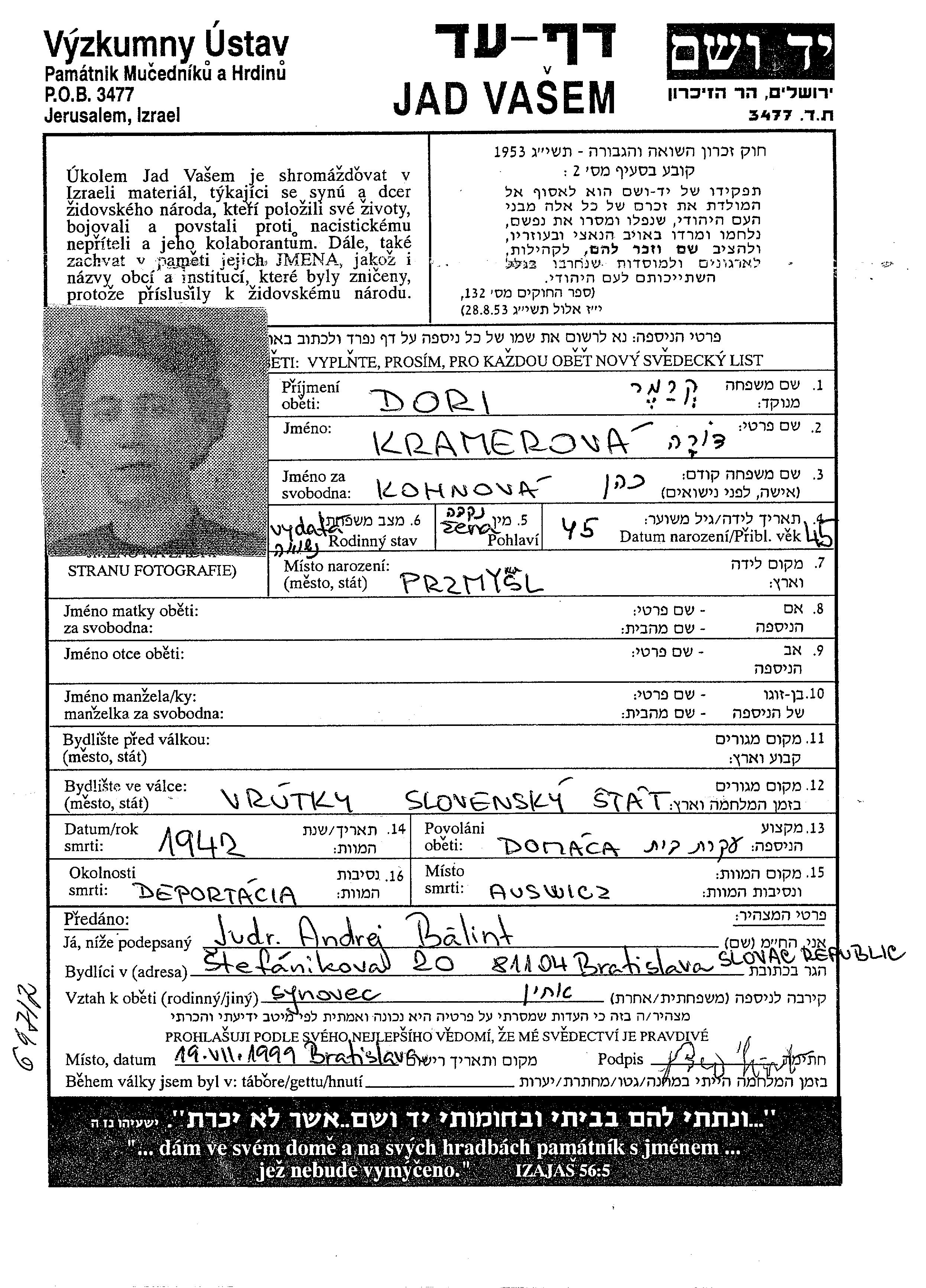 Dori Dora Kramerov Kremer, geb. Kohnova wurde in Przemysl, Polen geboren.