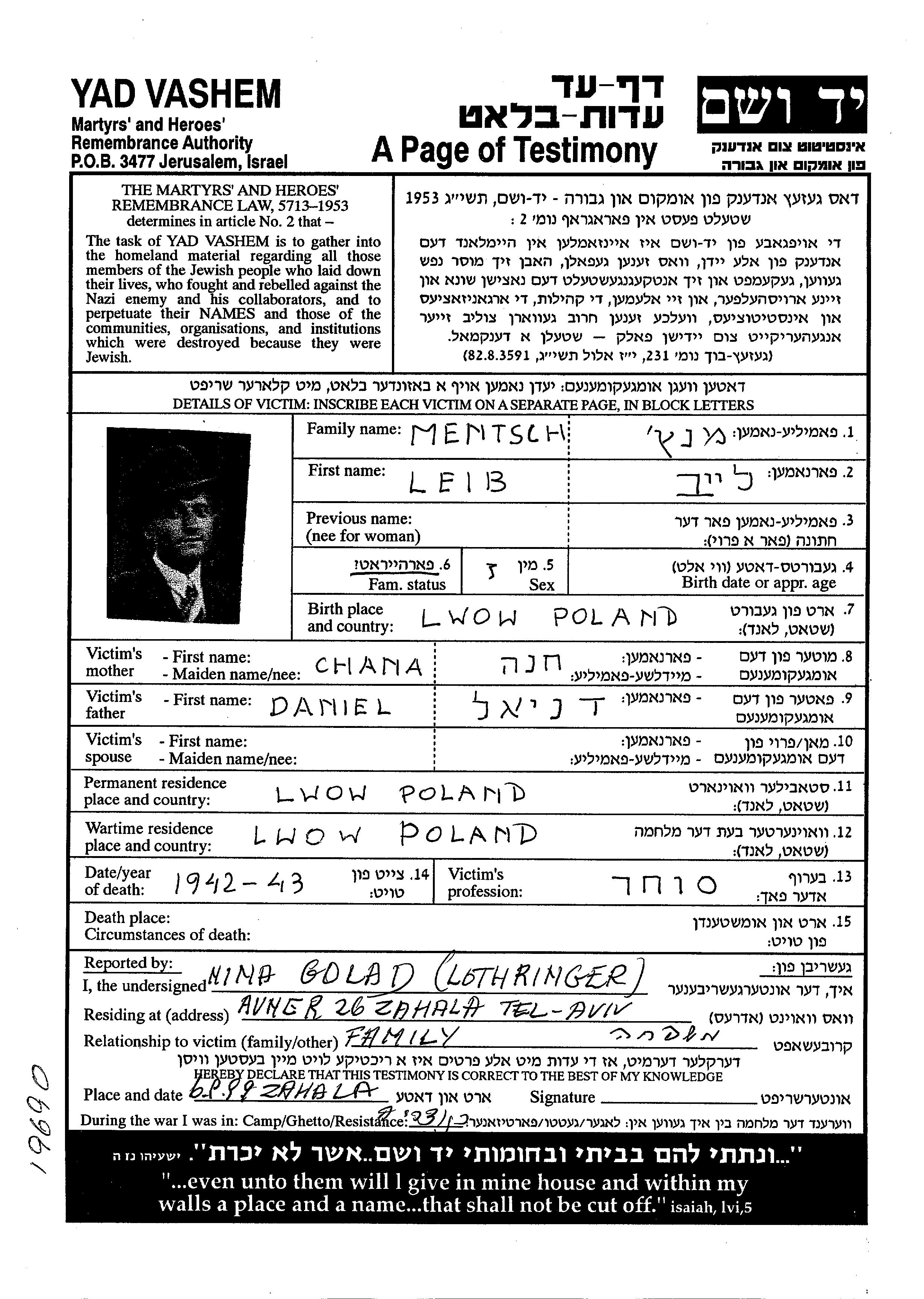 Leib Mentsch wurde in Warszawa, Polen geboren. Er war Kaufmann/-frau. Vor dem Zweiten Weltkrieg lebte er in Warszawa, Polen.