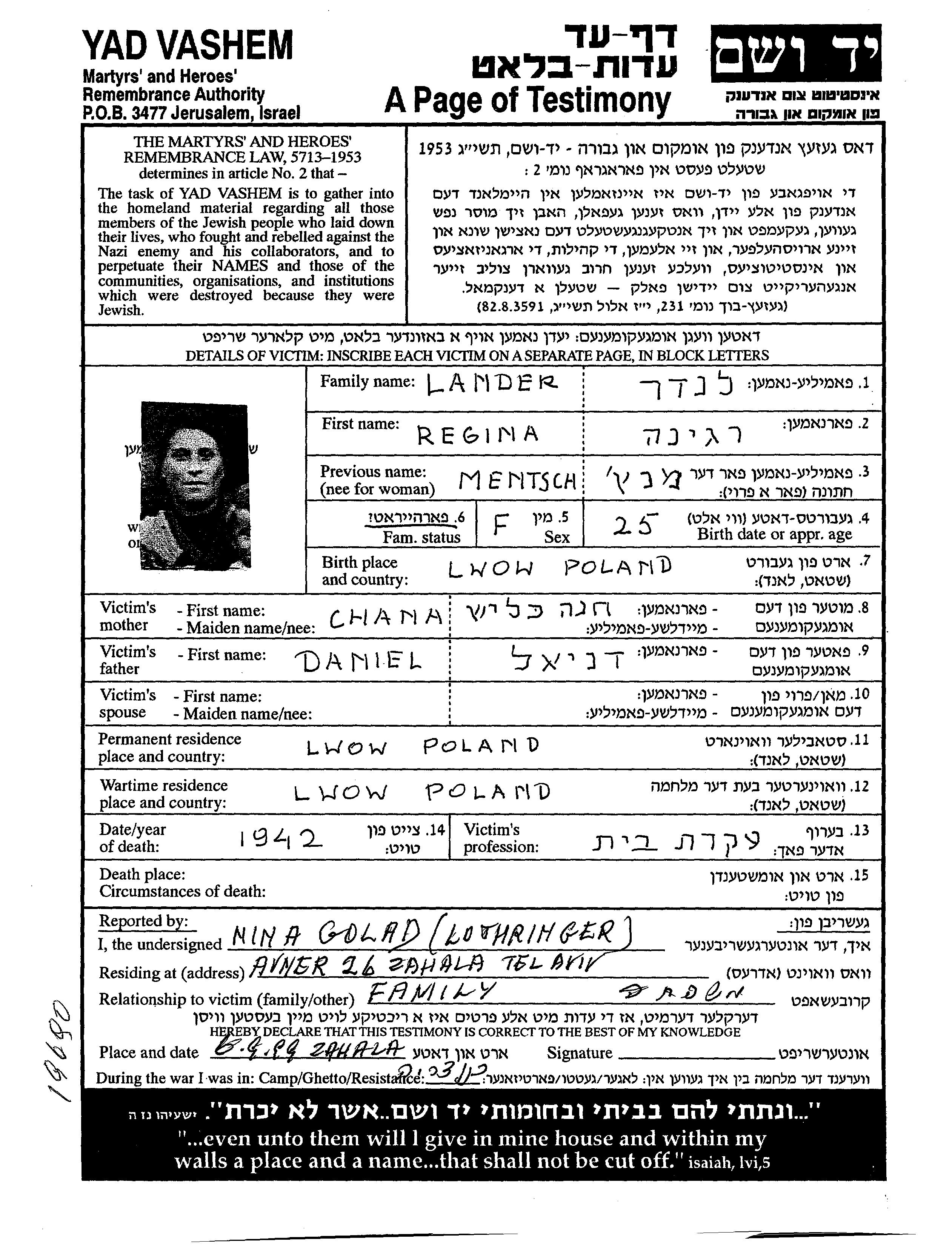 Regina Lander, geb. Mentsch wurde in Lwow, Polen geboren. Sie war Hausfrau. Vor dem Zweiten Weltkrieg lebte sie in Lwow, Polen.