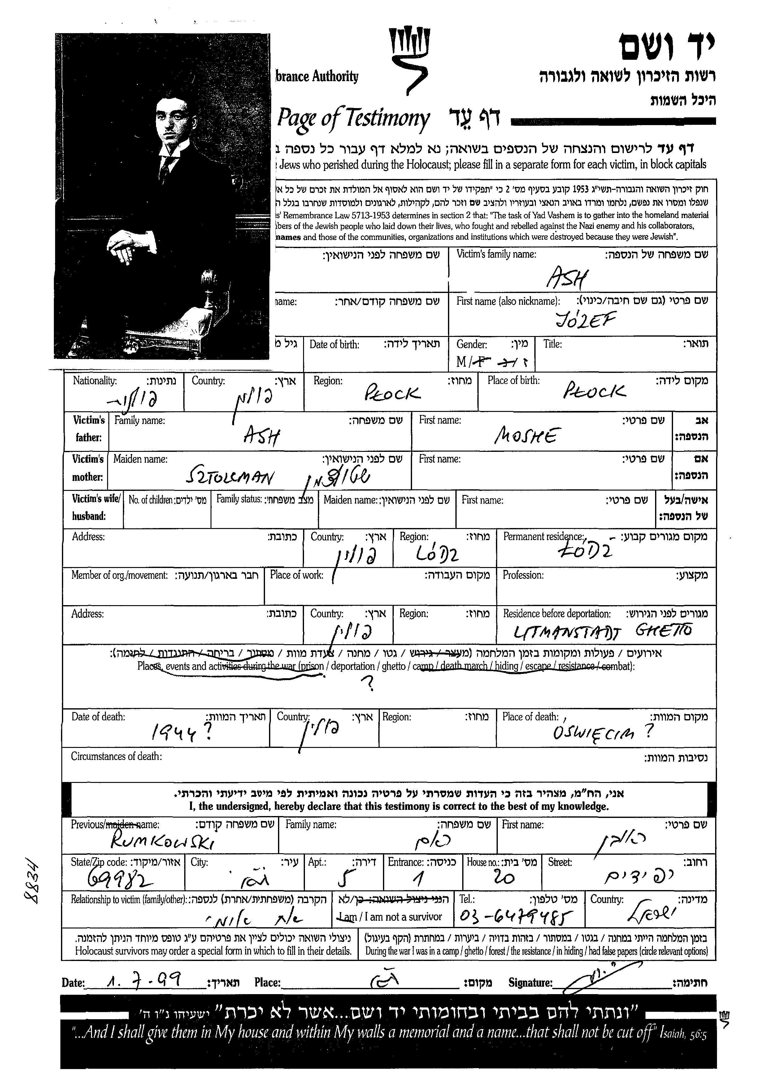 Jozef Ash wurde in Plock, Polen geboren. Vor dem Zweiten Weltkrieg lebte er in Łódź, Polen.