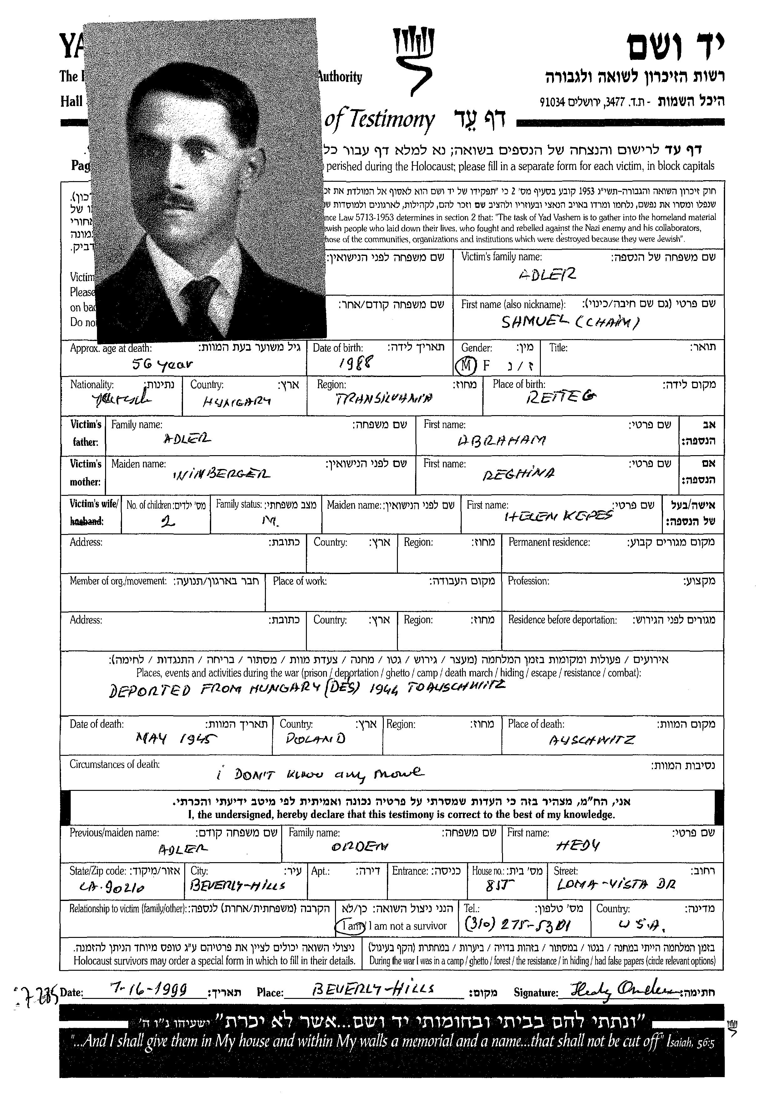 Chaim Samuel wurde in der Schoah ermordet. Todesort: Auschwitz, Polen im Jahr 1945.