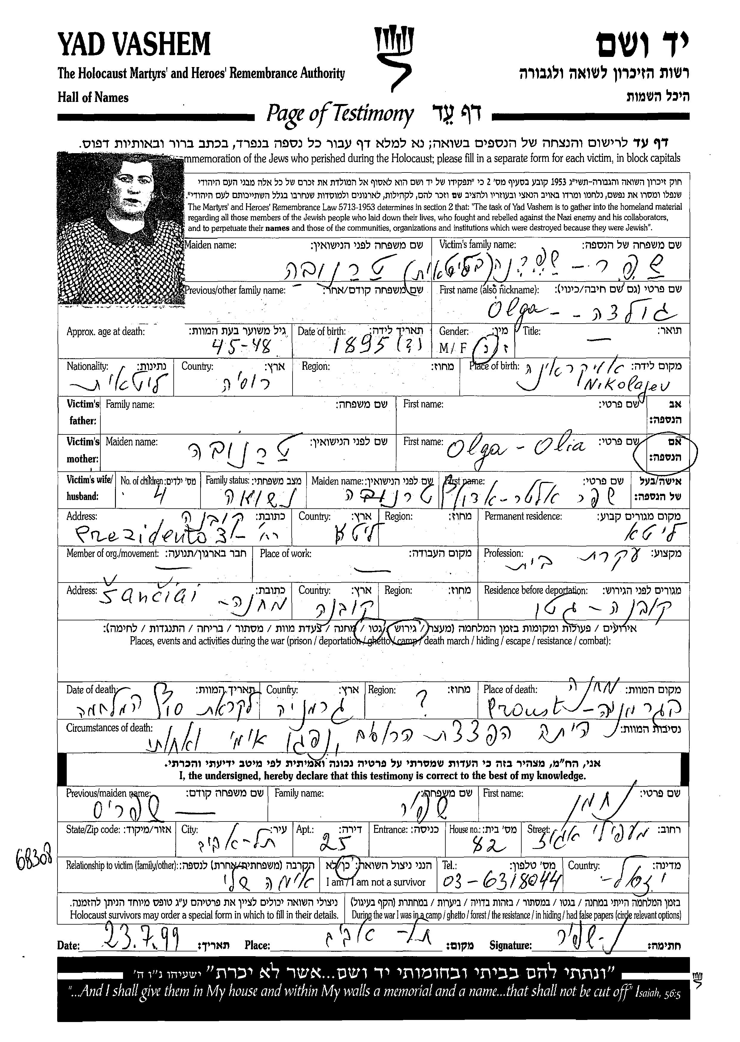 Olga Golda Shefer, geb. Taranova wurde im Jahr 1895 in Nikolayev, Ukraine (UdSSR) geboren. Sie war Hausfrau. Vor dem Zweiten Weltkrieg lebte sie in Kaunas, Litauen.