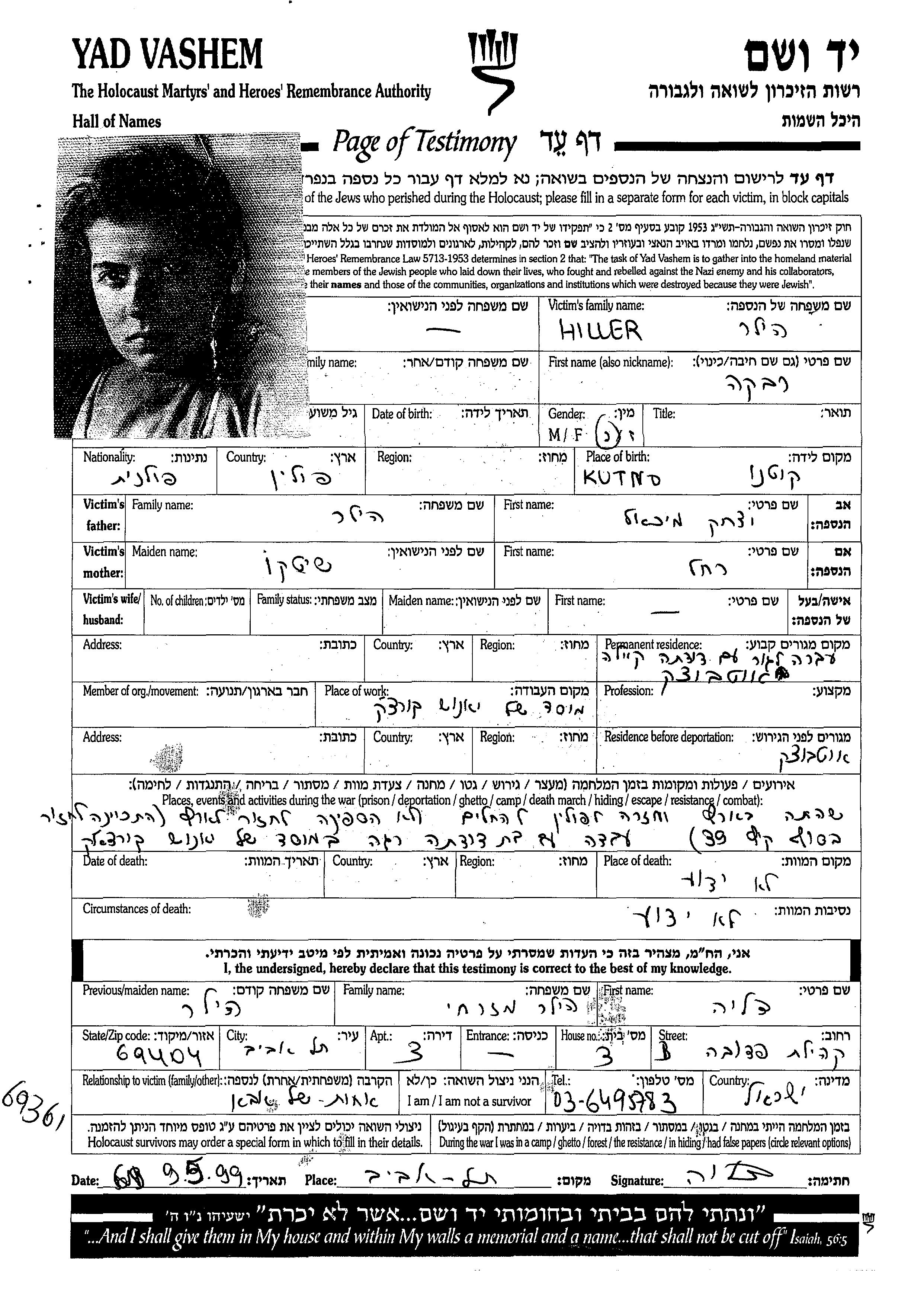 Rivka Hiller wurde in Kutno, Polen geboren. Vor dem Zweiten Weltkrieg lebte sie in Otwock, Polen.