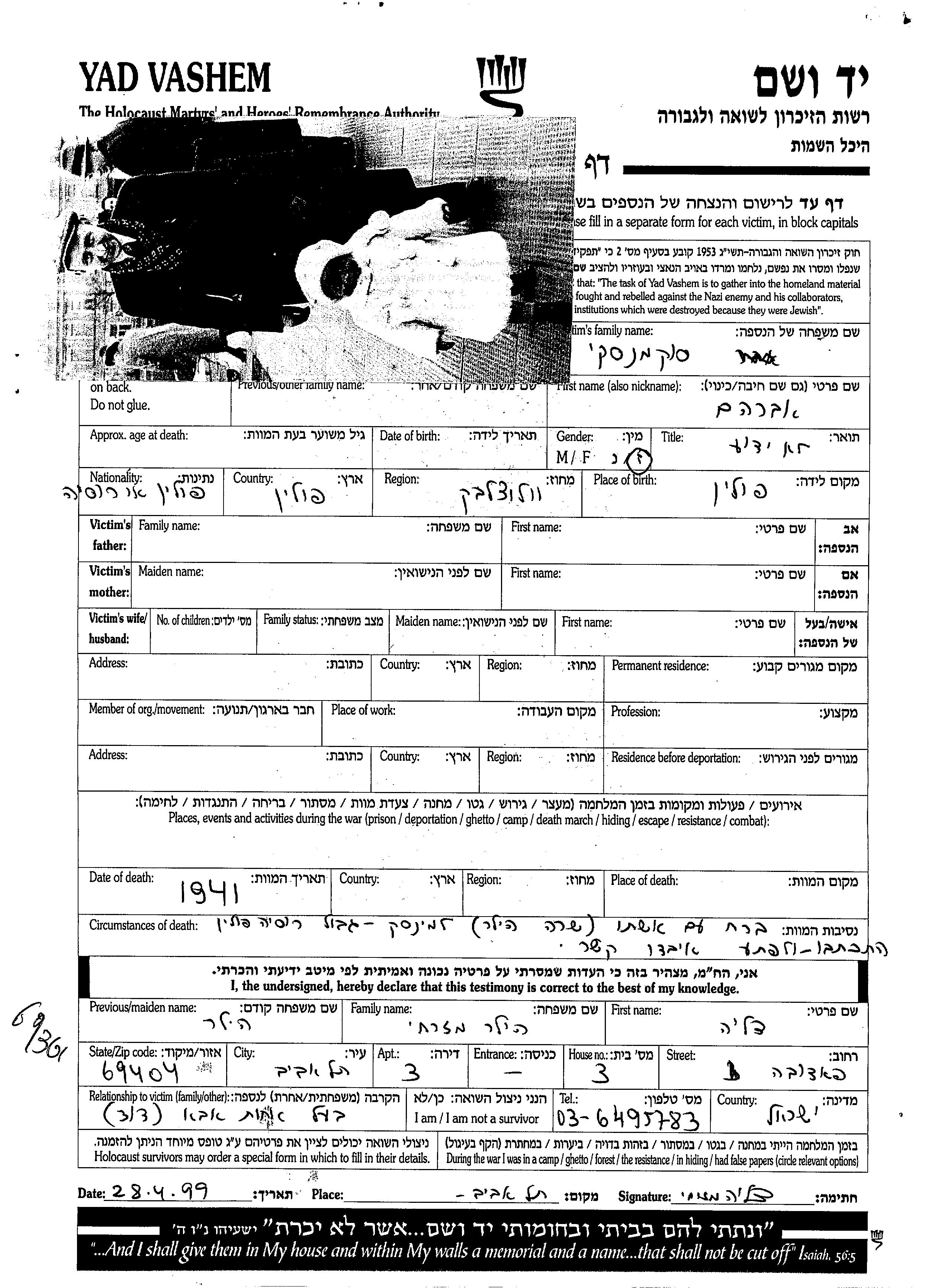 Avraham wurde in der Schoah ermordet. Todesort: unbekannter Ort im Jahr 1941.