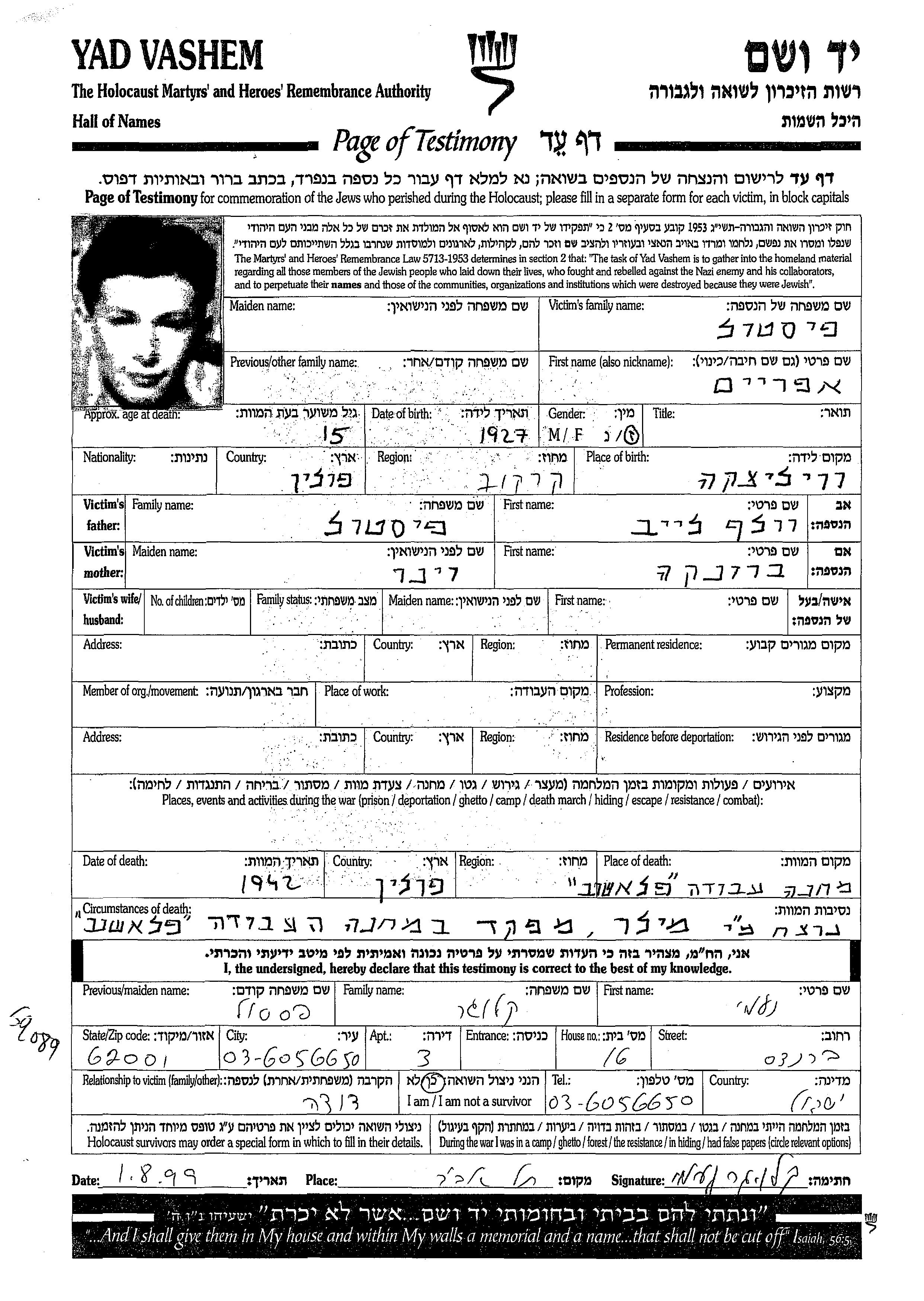 Efraim wurde in der Schoah ermordet. Todesort: Plaszow, Polen im Jahr 1942.