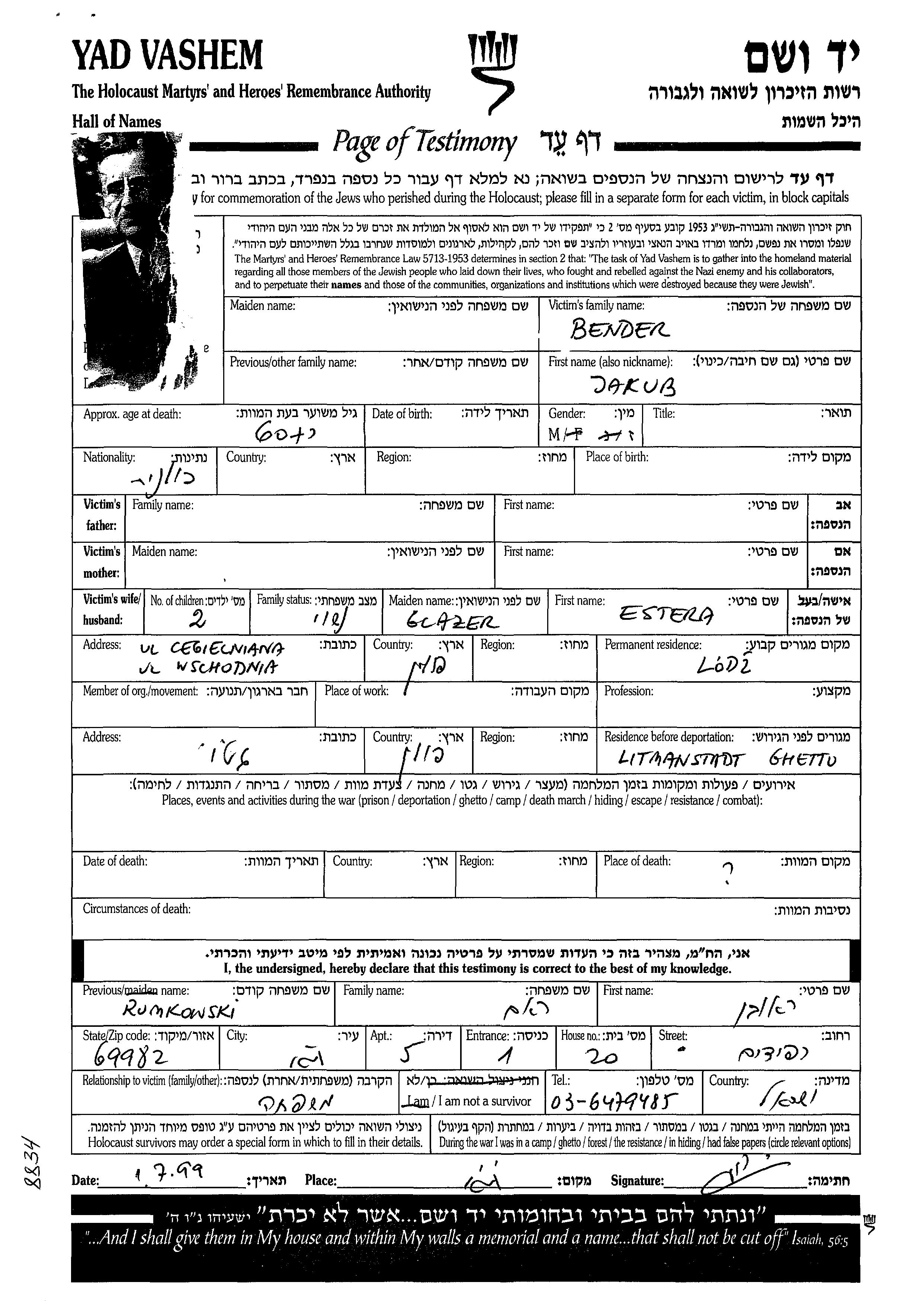 Jakub wurde in der Schoah ermordet. Todesort: unbekannter Ort.