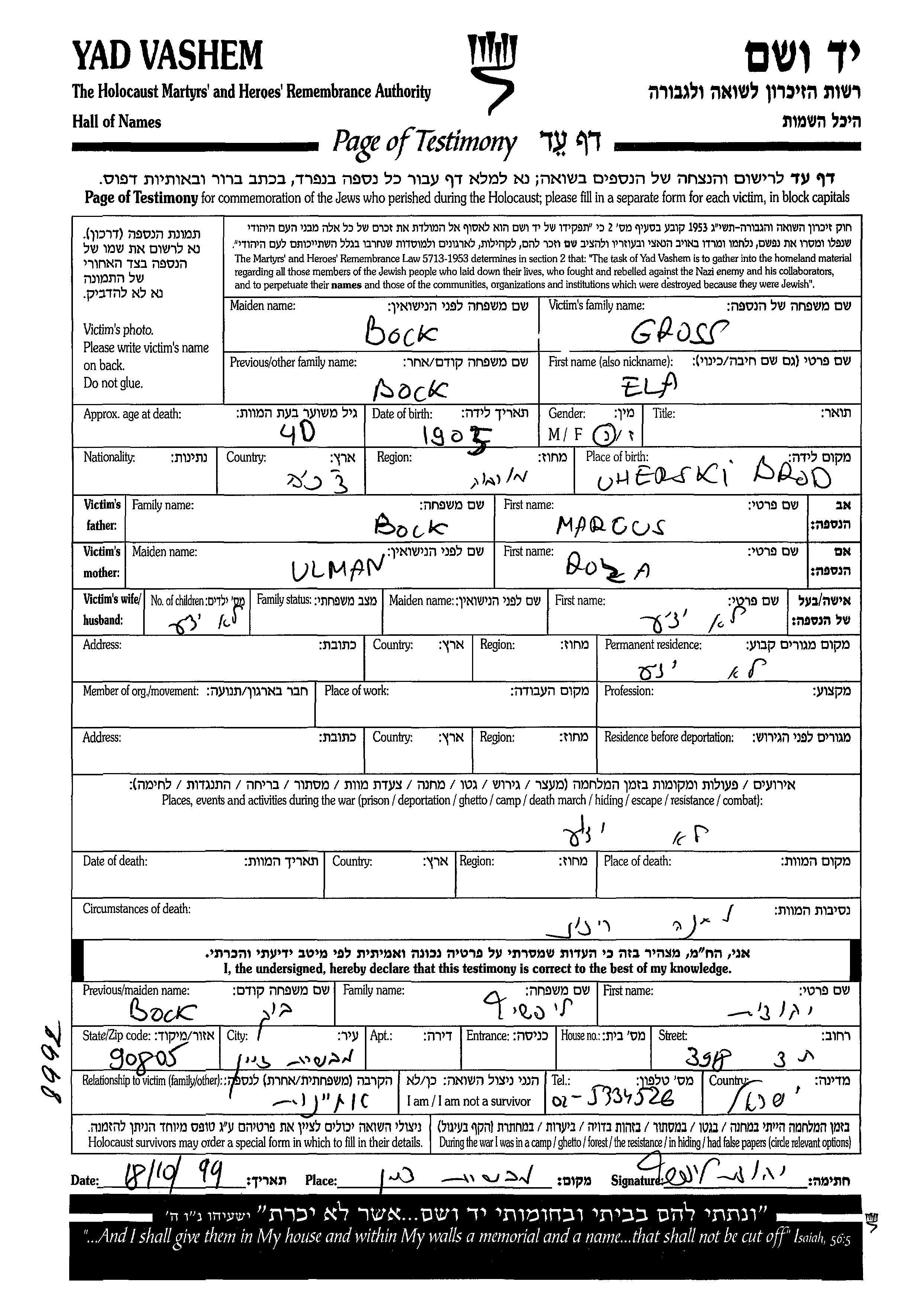 Ela Gross, geb. Bock wurde im Jahr 1905 in Uhersky Brod, Tschechoslowakei geboren.