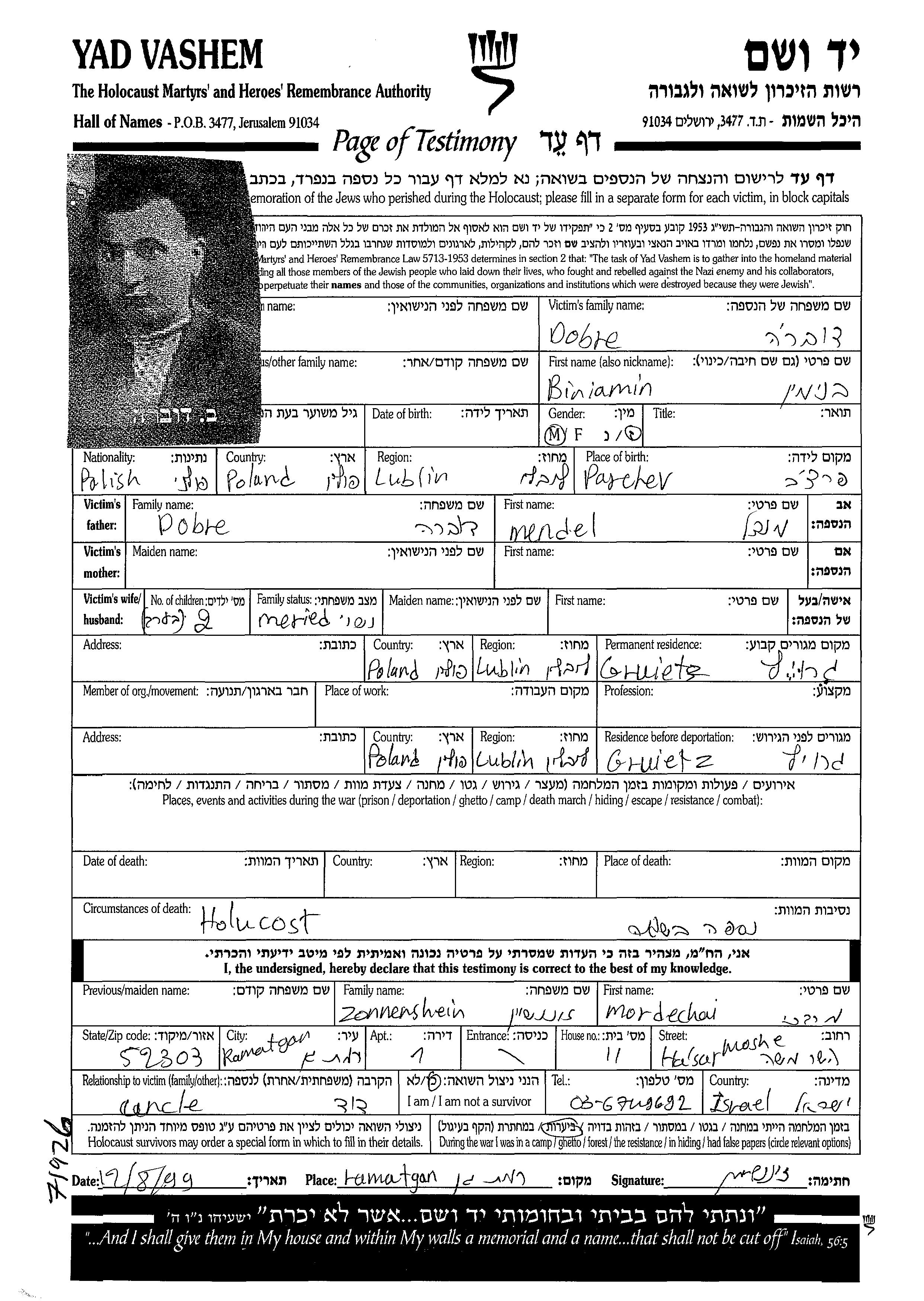 Biniamin Dobre wurde in Parczew, Polen geboren. Vor dem Zweiten Weltkrieg lebte er in Grojec, Polen.