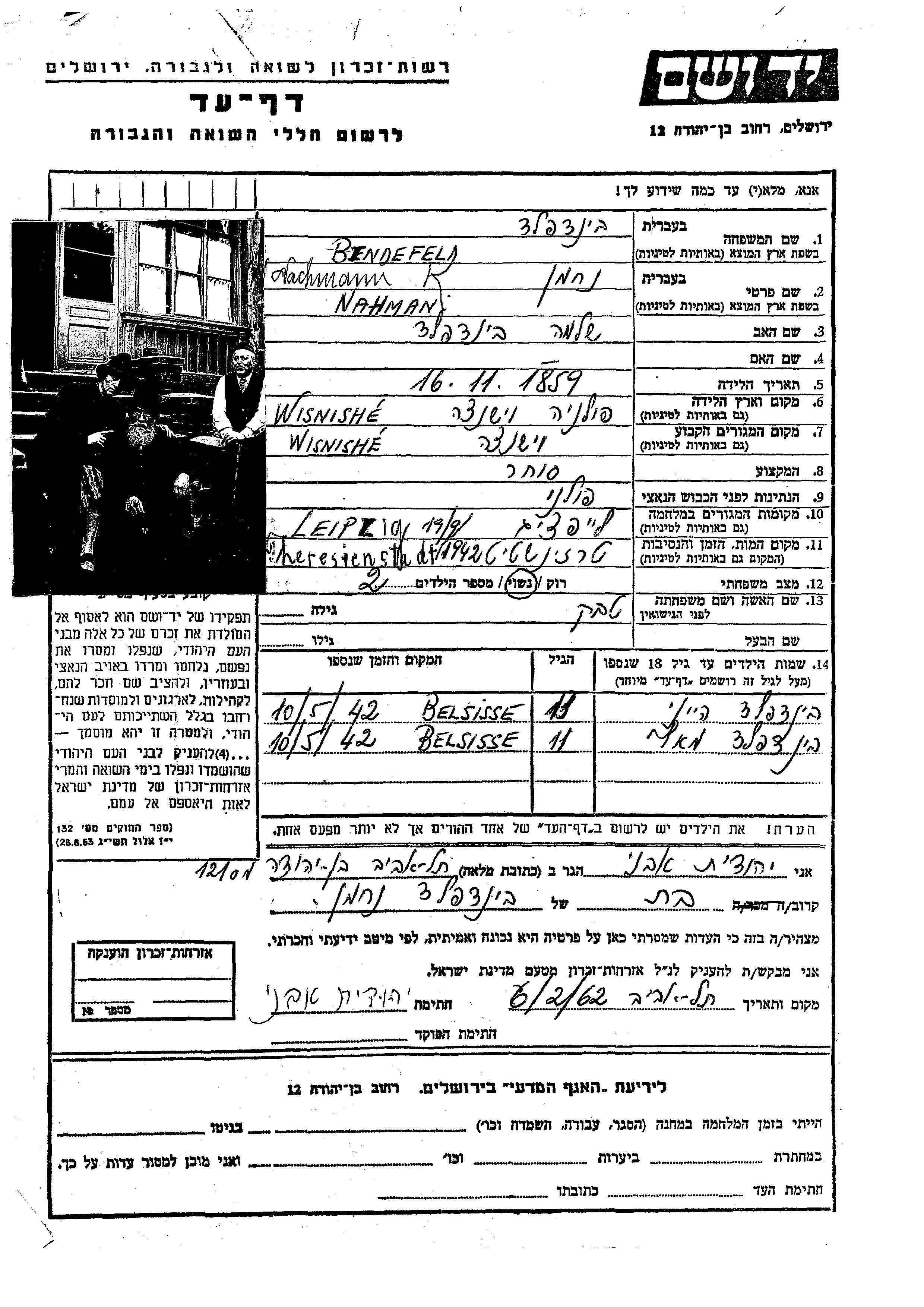 Nahman Bindefeld wurde im Jahr 1859 in Wisnicz, Polen geboren. Er war Kaufmann/-frau. Vor dem Zweiten Weltkrieg lebte er in Wisnicz, Polen.