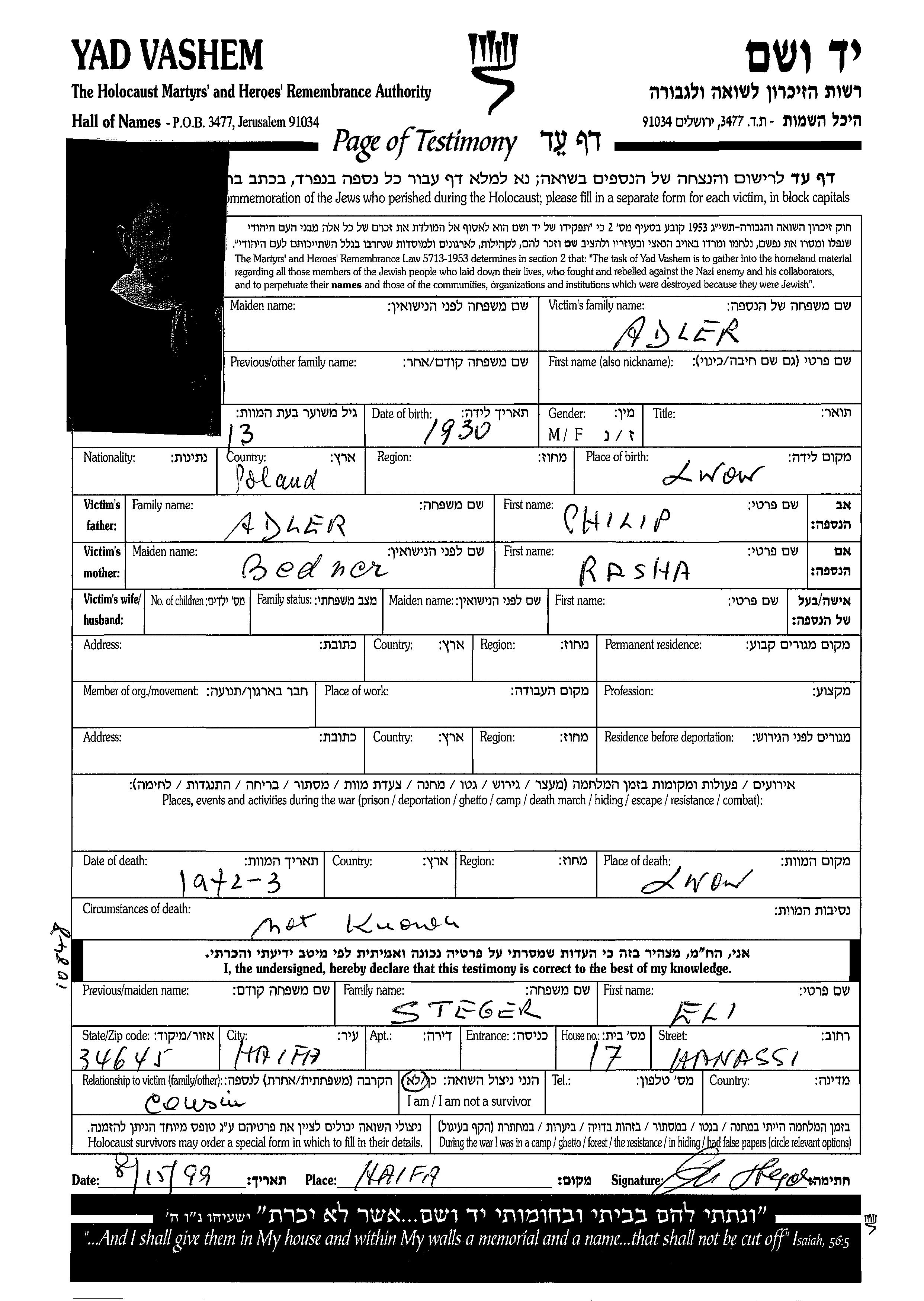 Vorname unbekannt Adler wurde im Jahr 1930 in Lwow, Polen geboren.