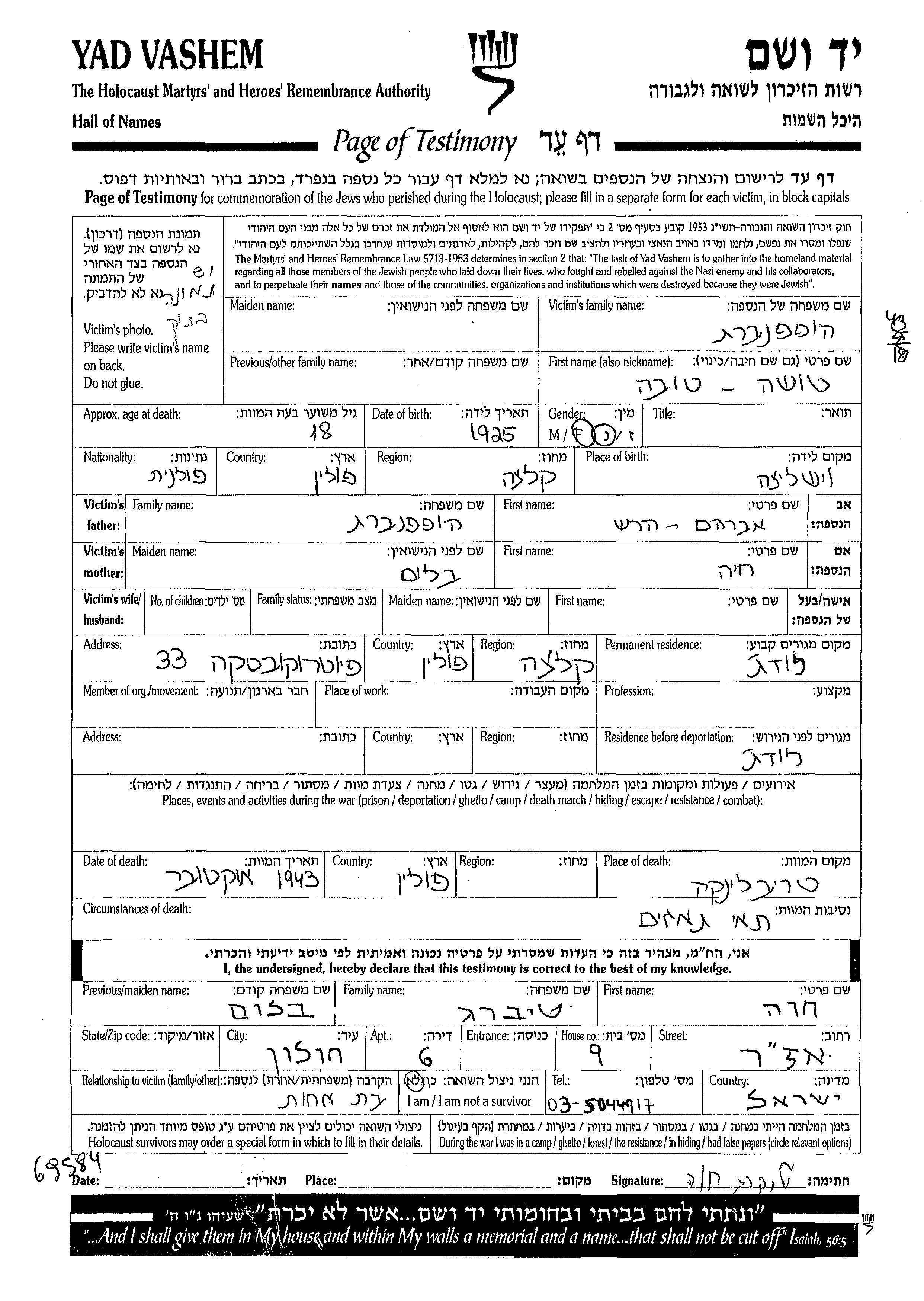 Tosha Tova wurde in der Schoah ermordet. Todesort: Treblinka, Polen im Jahr 1943.