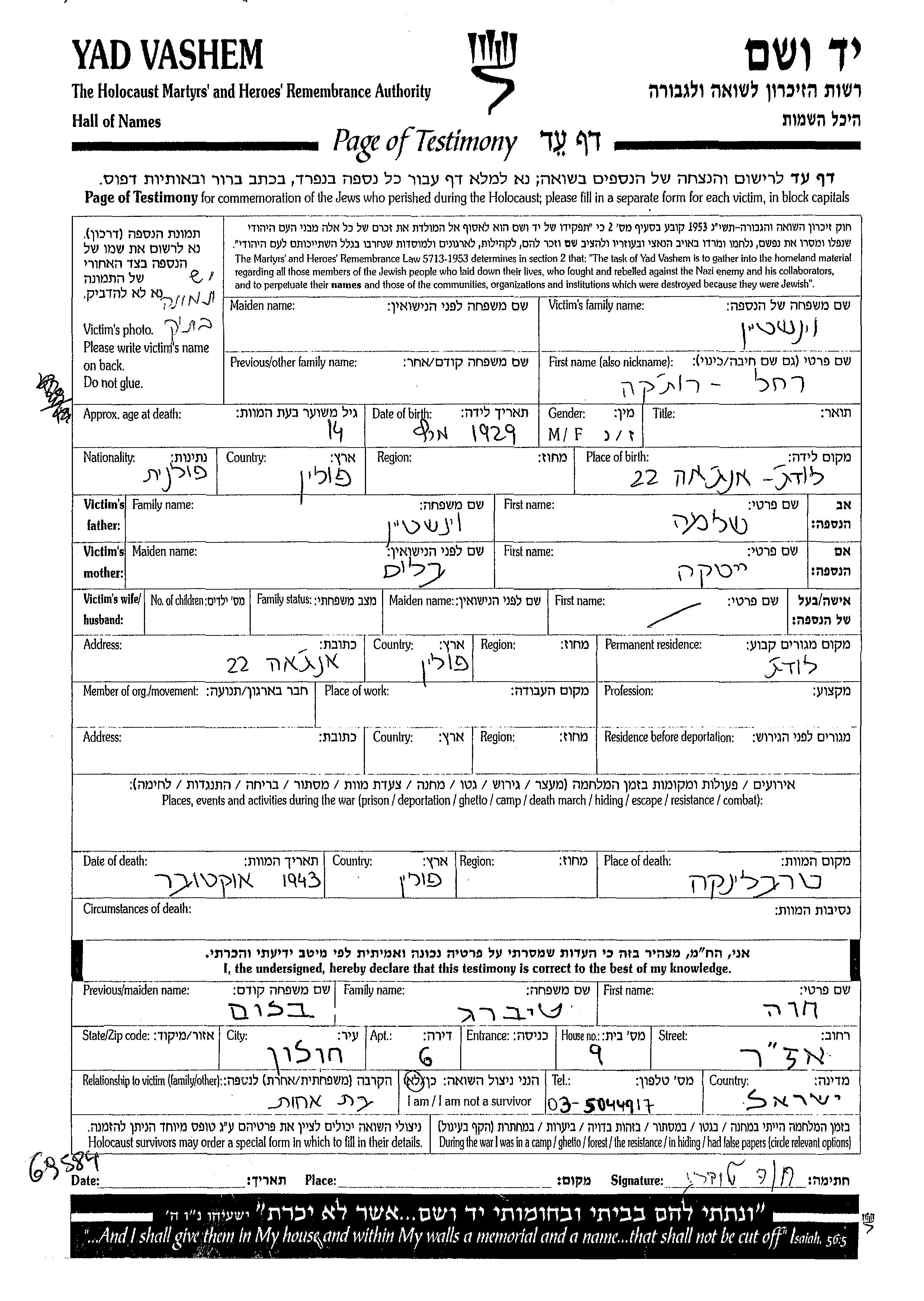 Rakhel Rut wurde in der Schoah ermordet. Todesort: Treblinka, Polen im Jahr 1943.