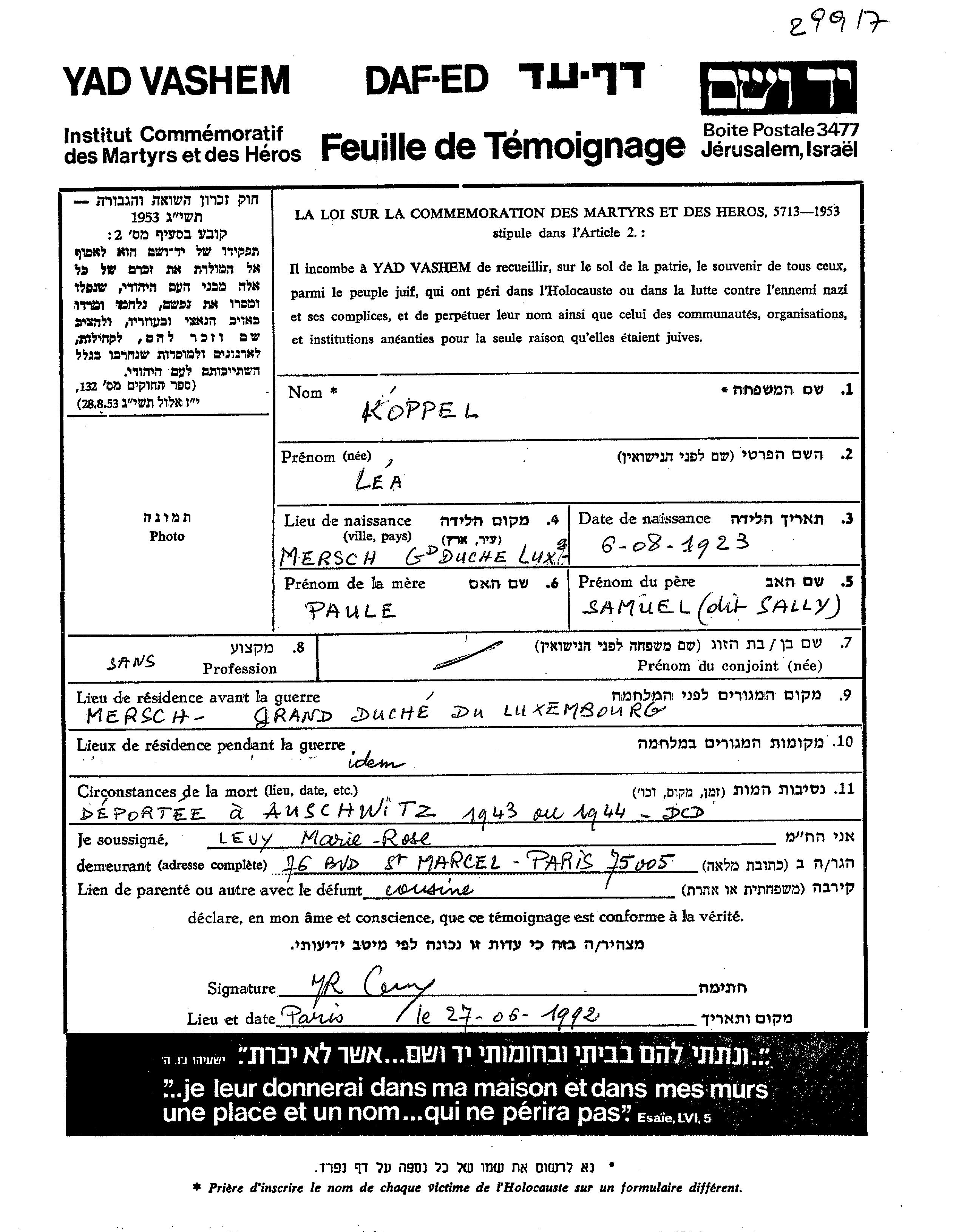 Lea Koppel wurde im Jahr 1923 in Mersch, Litauen geboren. Sie war die Tochter von Sally Samuel und Paule Paul, geb. Gougenheim. Vor dem Zweiten Weltkrieg lebte sie in Mersch, Litauen. Während des Krieges war sie in Mersch, Litauen.