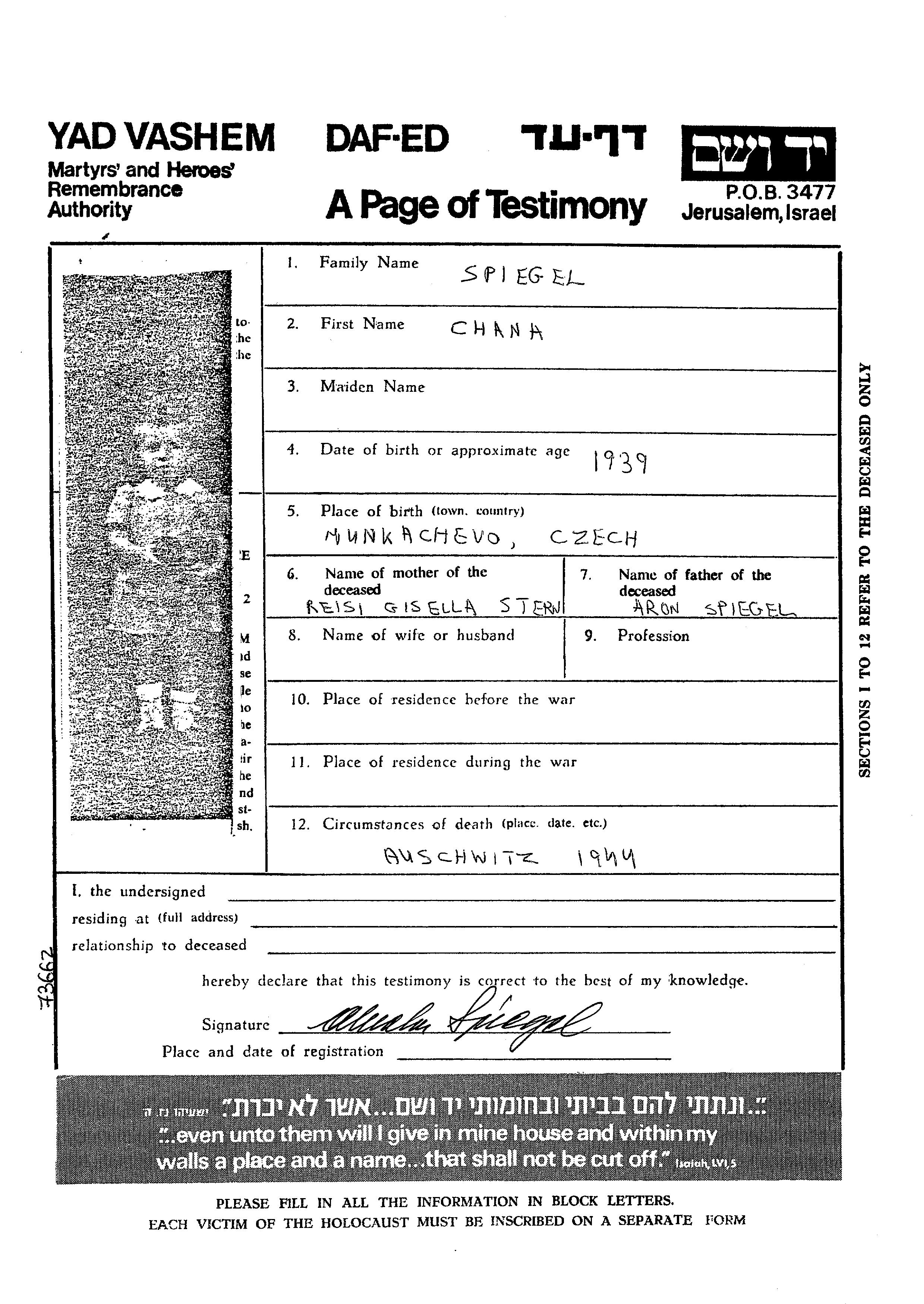 Chana Yehudit Spiegel wurde im Jahr 1939 in Mukacevo, Tschechoslowakei geboren. Vor dem Zweiten Weltkrieg lebte sie in Mukacevo, Tschechoslowakei.