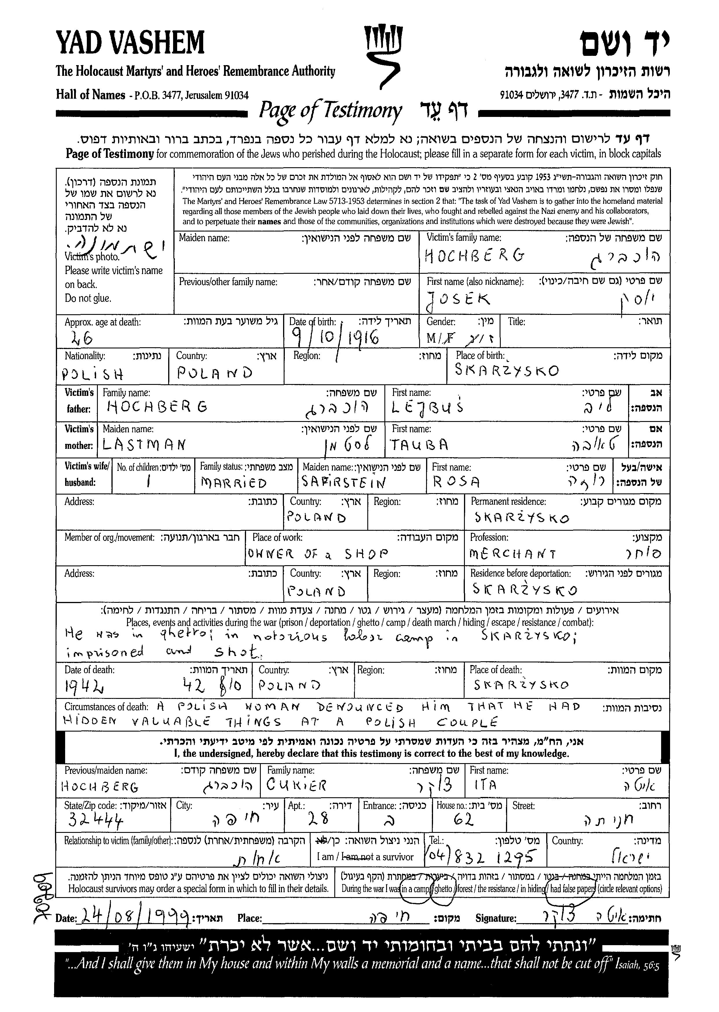 Josek Hochberg wurde im Jahr 1916 in Skarzysko Kamienna, Polen geboren. Er war Kaufmann/-frau. Vor dem Zweiten Weltkrieg lebte er in Skarzysko Kamienna, Polen.