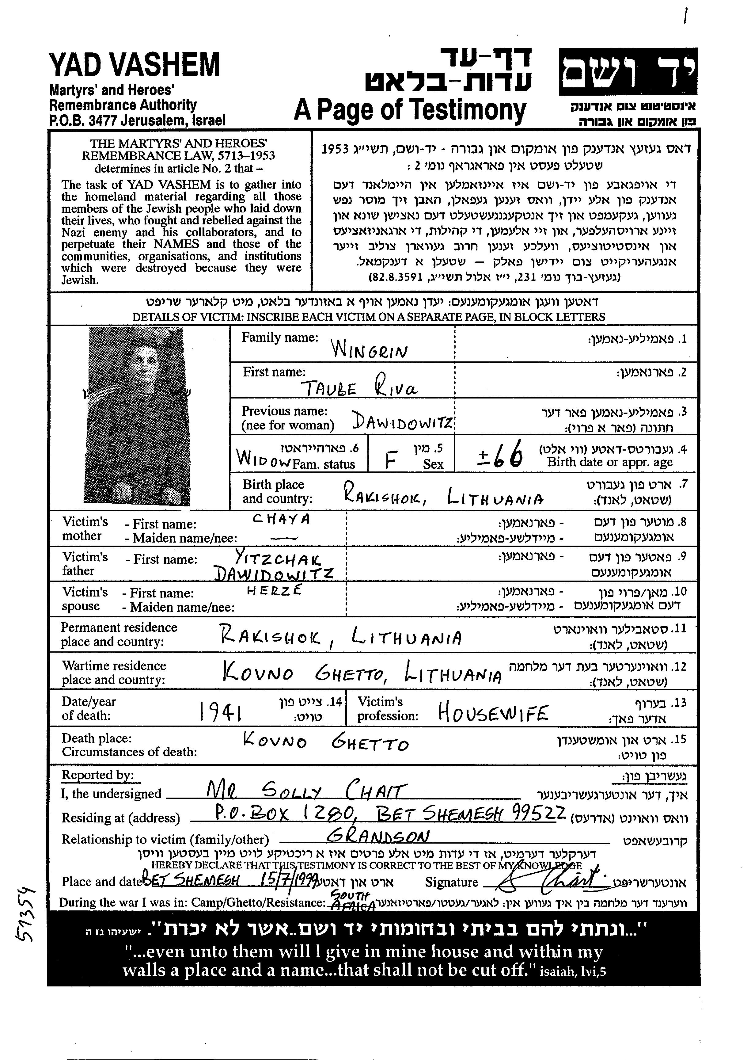 Tauba Riva Wingrin, geb. Dawidowitz wurde in Rokiskis, Litauen geboren. Sie war Hausfrau. Vor dem Zweiten Weltkrieg lebte sie in Rokiskis, Litauen.