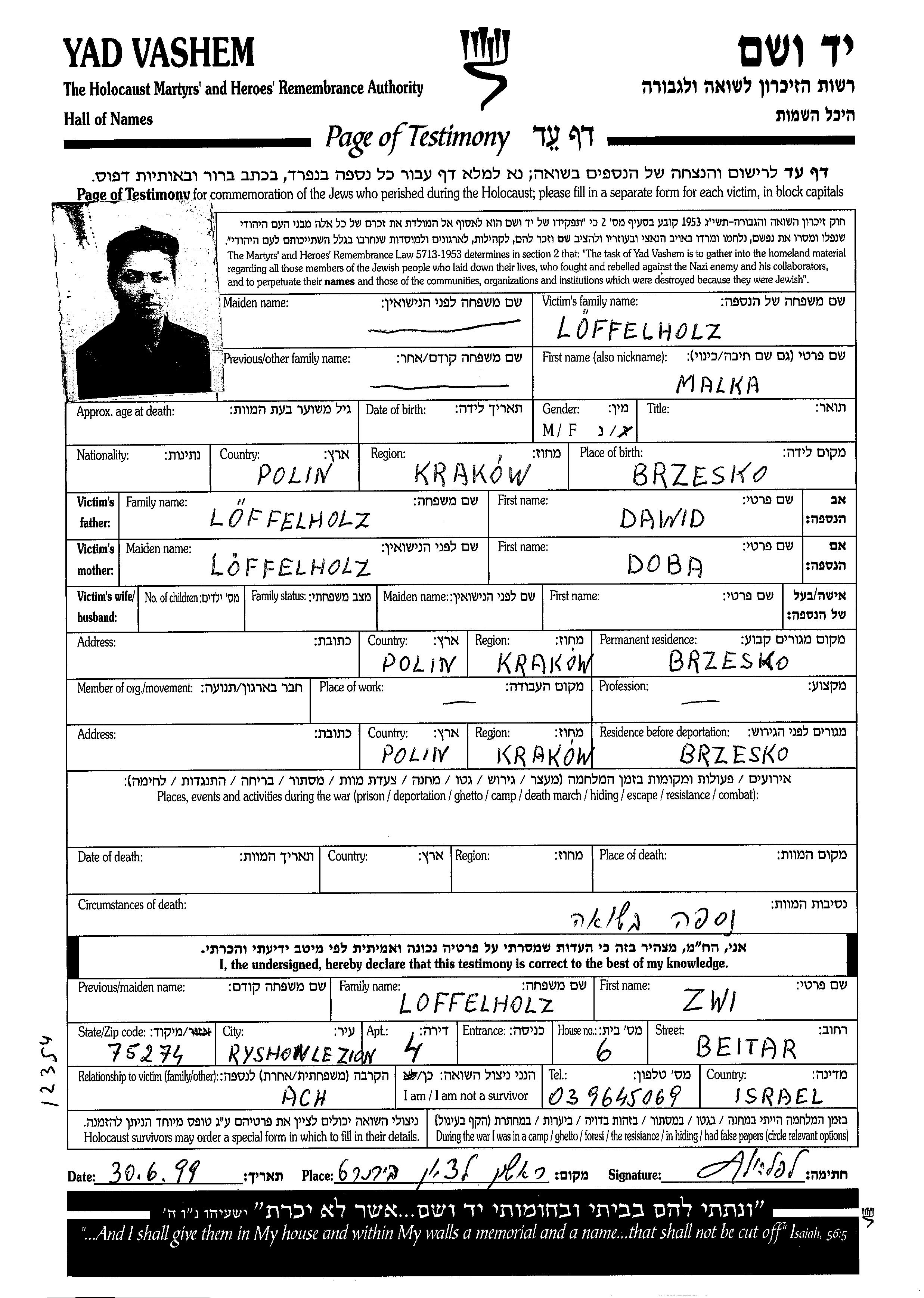 Malka Löffelholz wurde in Brzesko, Polen geboren. Vor dem Zweiten Weltkrieg lebte sie in Brzesko, Polen.