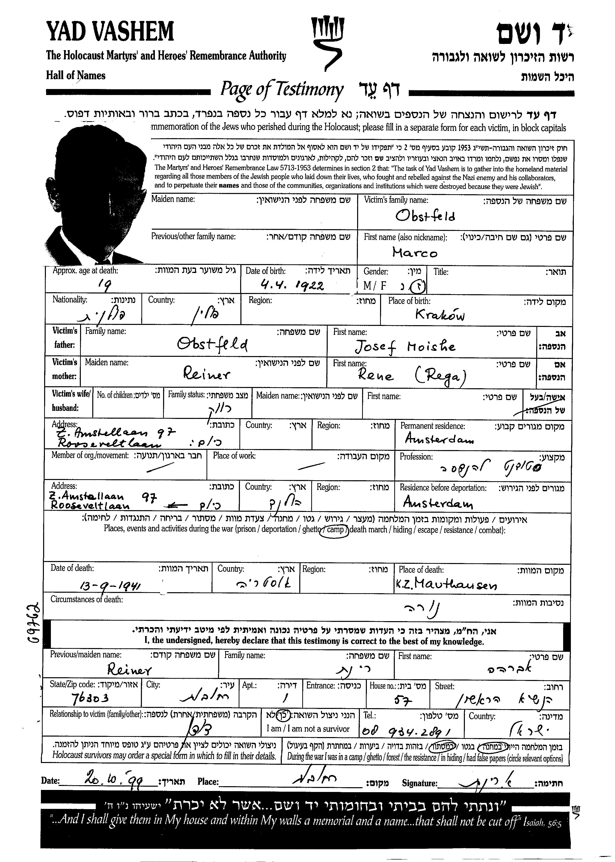 Obstfeld | Marco | 1922 | Krakow, Polen | Liste von ermordeten Juden aus Holland |
