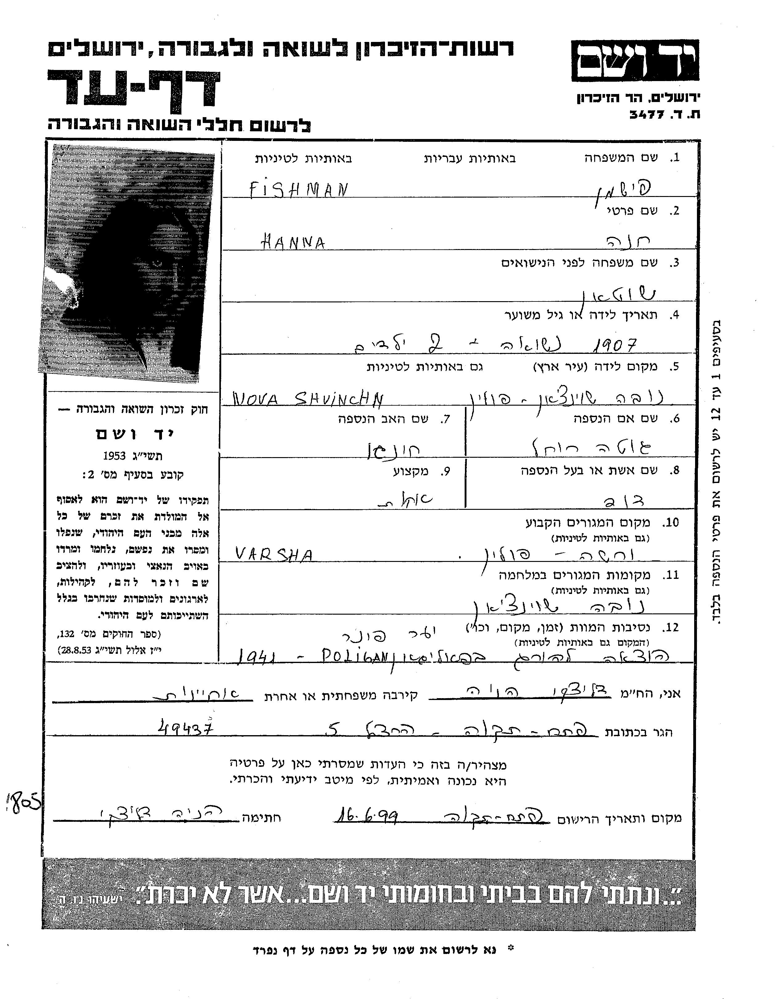 Hanna Fishman, geb. Sautan wurde im Jahr 1907 in Nowe Swieciany, Polen geboren. Sie war Krankenpfleger/-in. Vor dem Zweiten Weltkrieg lebte sie in Warszawa, Polen.