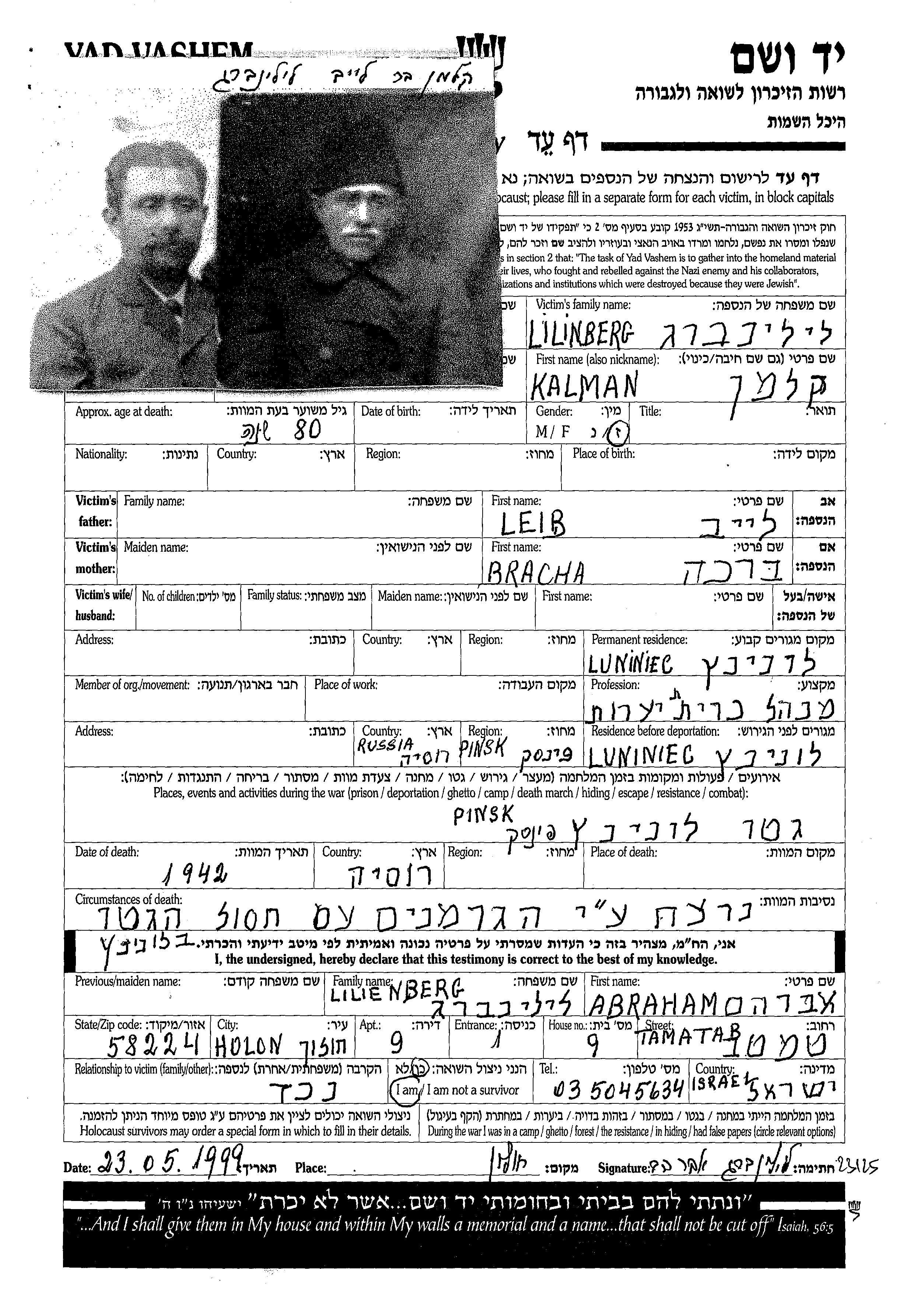Kalman Lilinberg. Er war Forestry foreman. Vor dem Zweiten Weltkrieg lebte er in Luniniec, Polen.