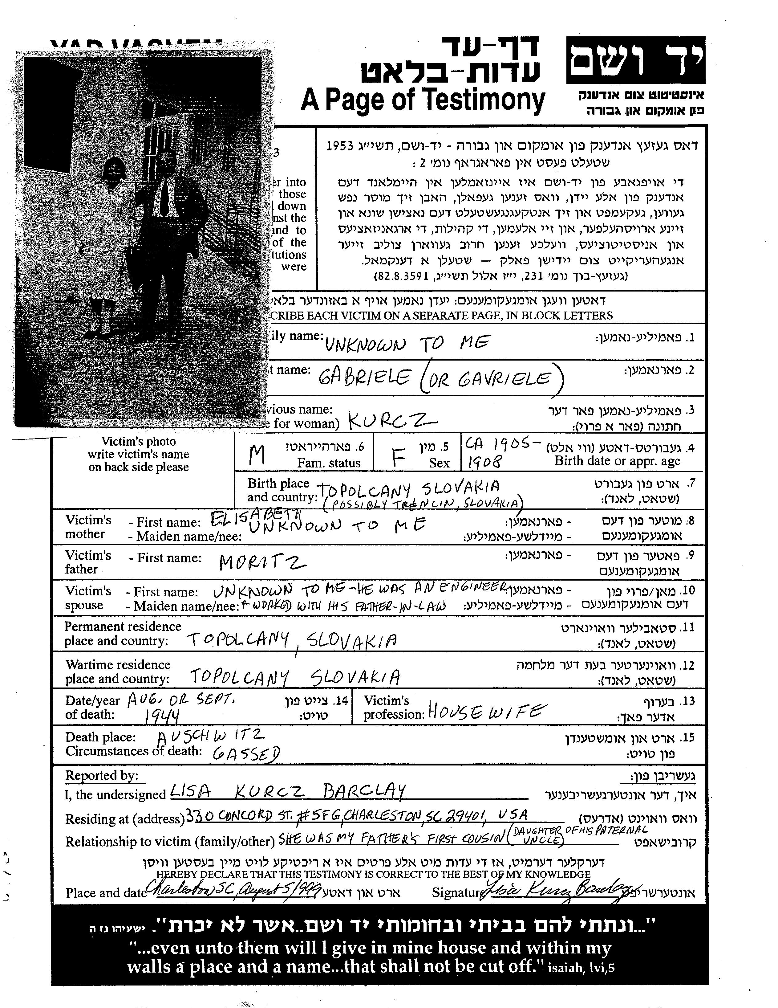 Name unbekannt | Gabriele Gavriele | 1905 | Topolcany, Tschechoslowakei | Gedenkblatt |