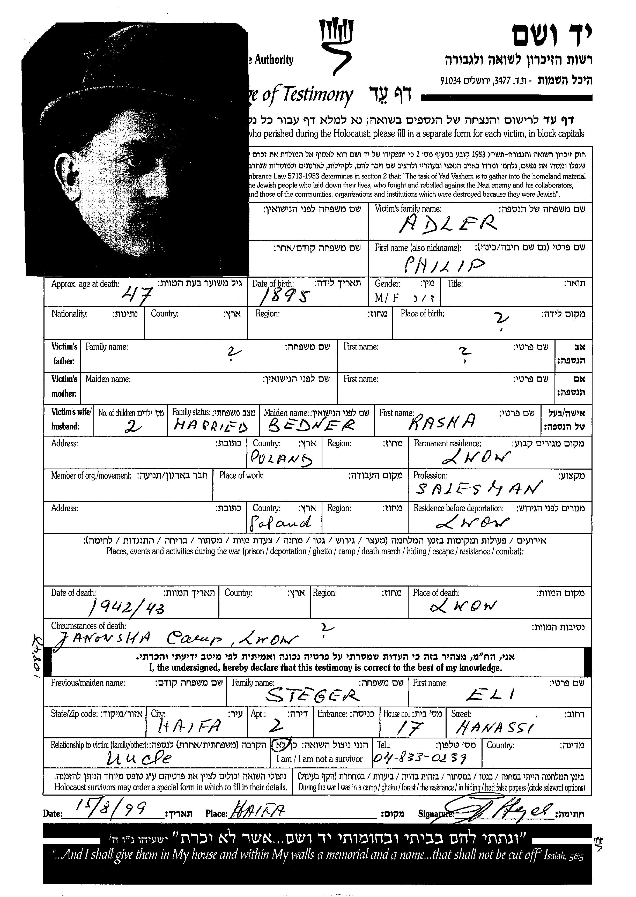 Philip Adler wurde im Jahr 1895 geboren. Er war Handelsvertreter/in. Vor dem Zweiten Weltkrieg lebte er in Lwow, Polen.