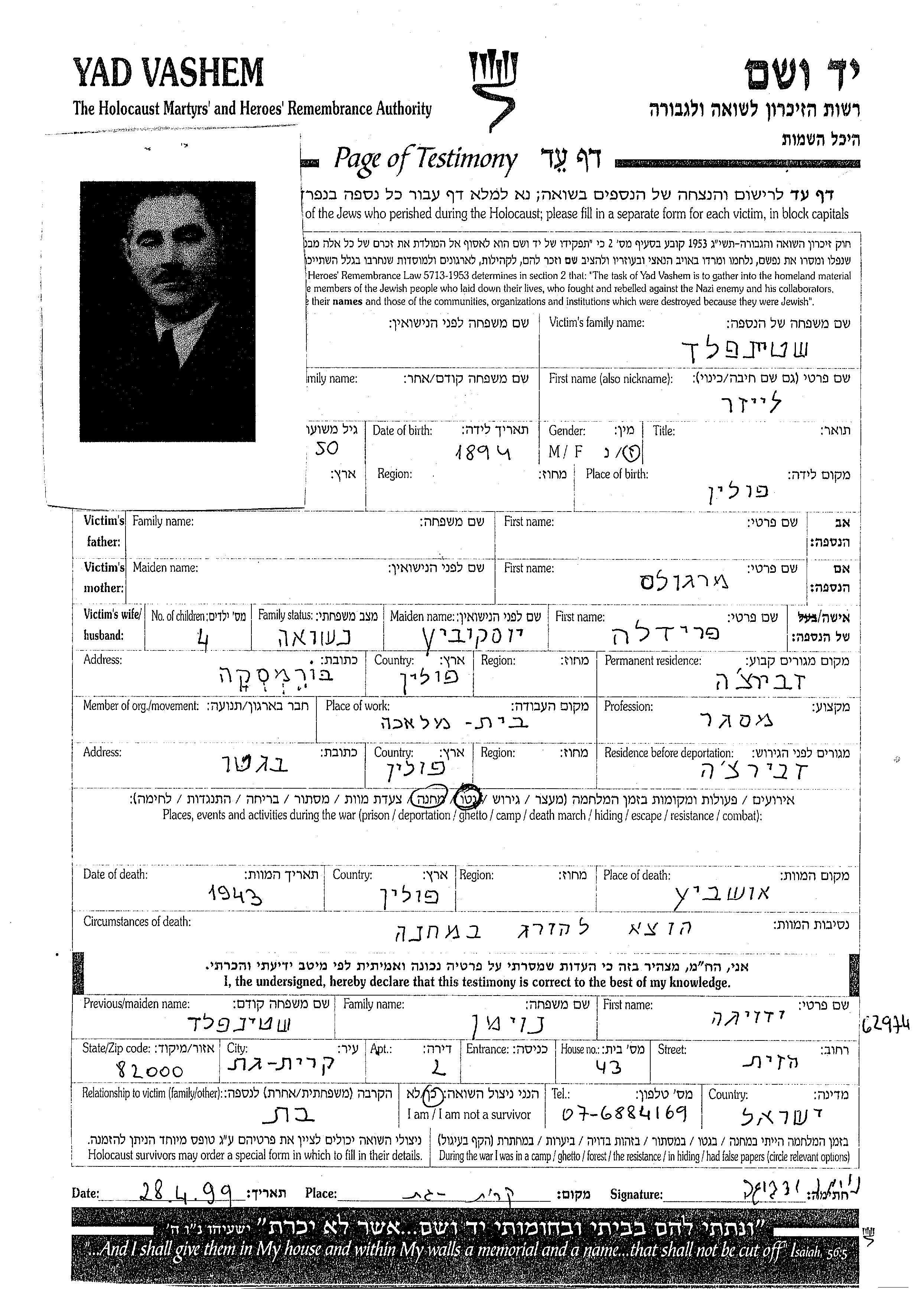 Leizer Shteinfeld wurde im Jahr 1894 in Polen geboren. Er war Schlosser. Vor dem Zweiten Weltkrieg lebte er in Zawiercie, Polen.