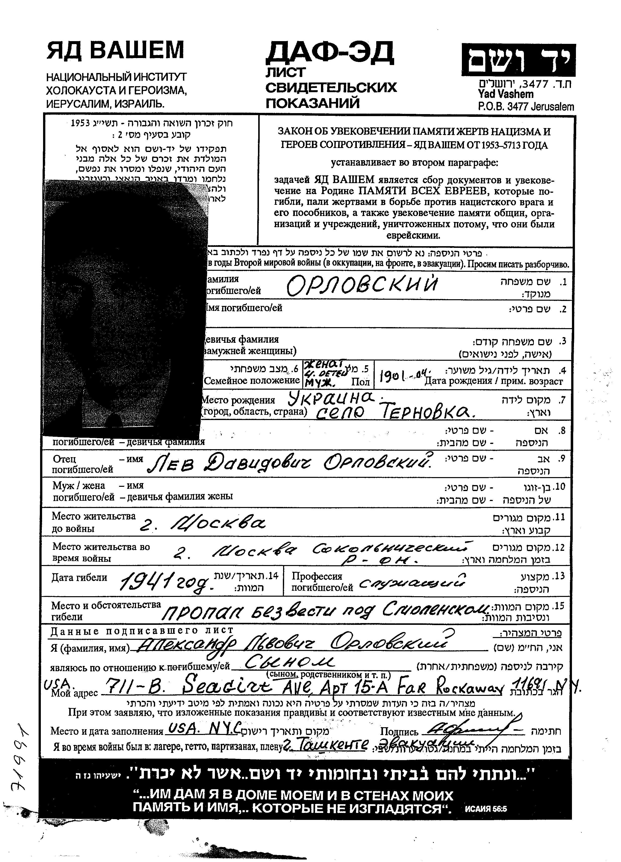 Orlovski | Vorname unbekannt | 1901 | Moskva, Russland (UdSSR) | Gedenkblatt |