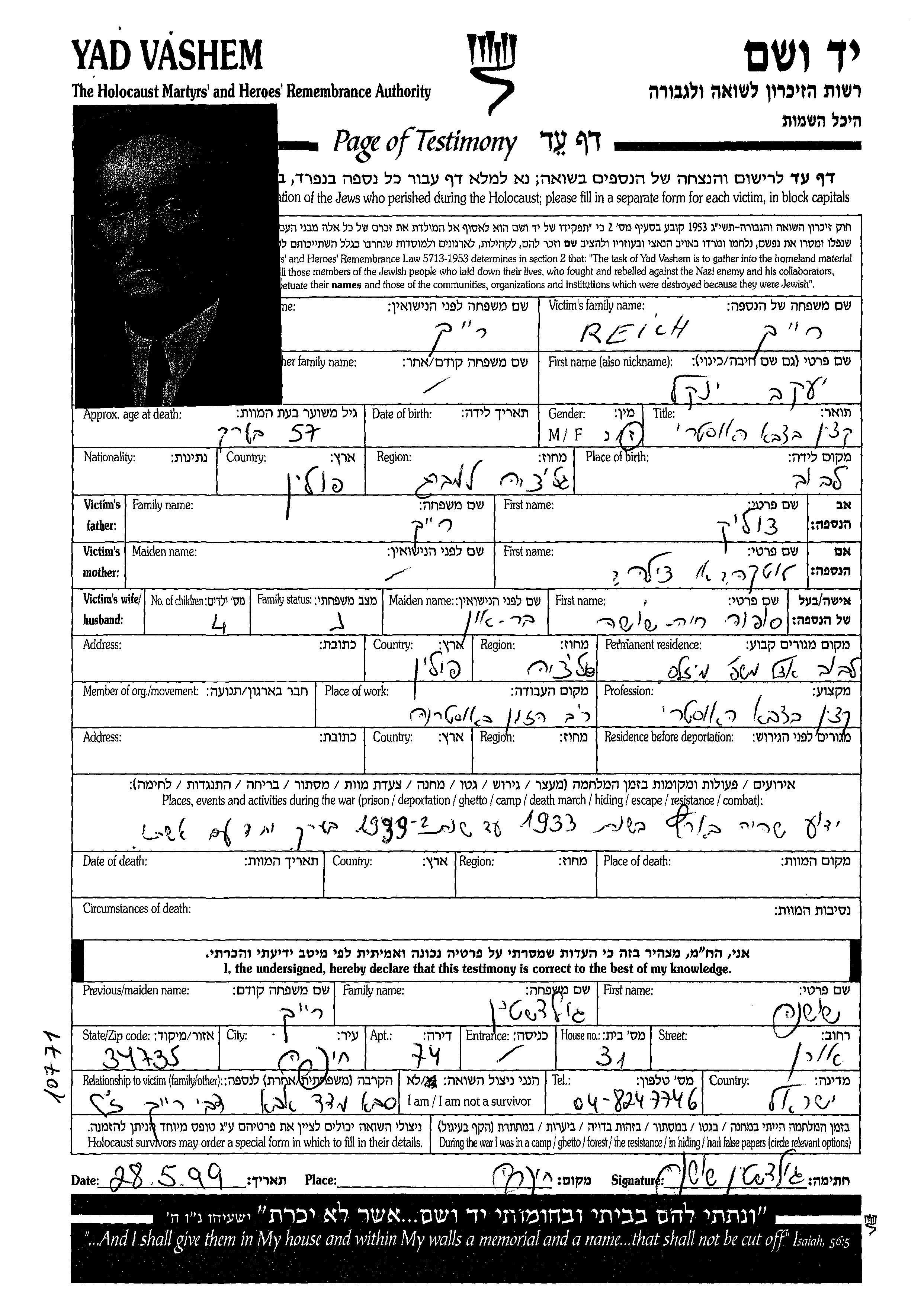 Yaakov Reich wurde in Lwow, Polen geboren. Er war Armeeoffizier. Vor dem Zweiten Weltkrieg lebte er in Lwow, Polen.