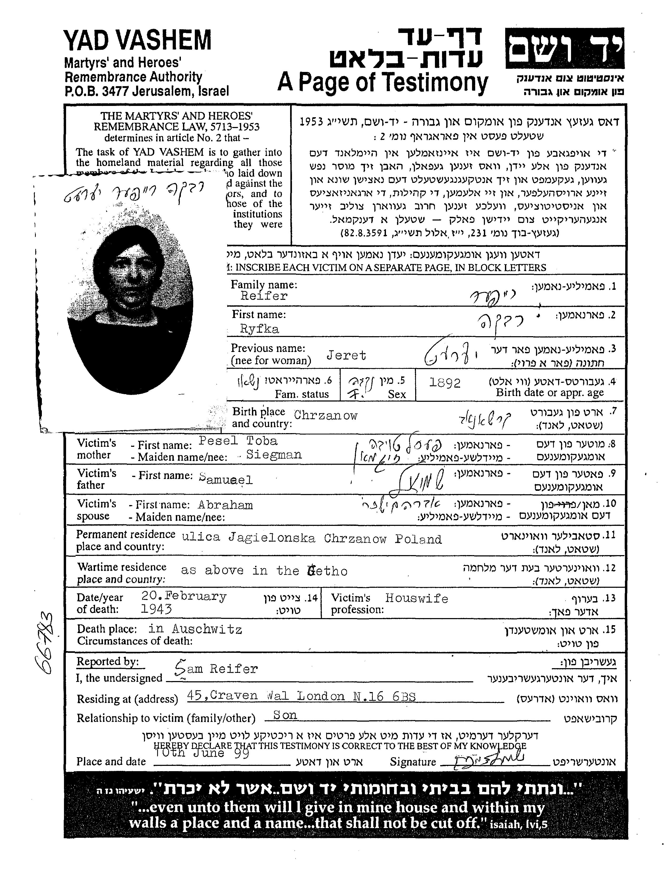 Rivka Reifer, geb. Jeret wurde im Jahr 1892 in Chrzanow, Polen geboren. Sie war Hausfrau. Vor dem Zweiten Weltkrieg lebte sie in Chrzanow, Polen.