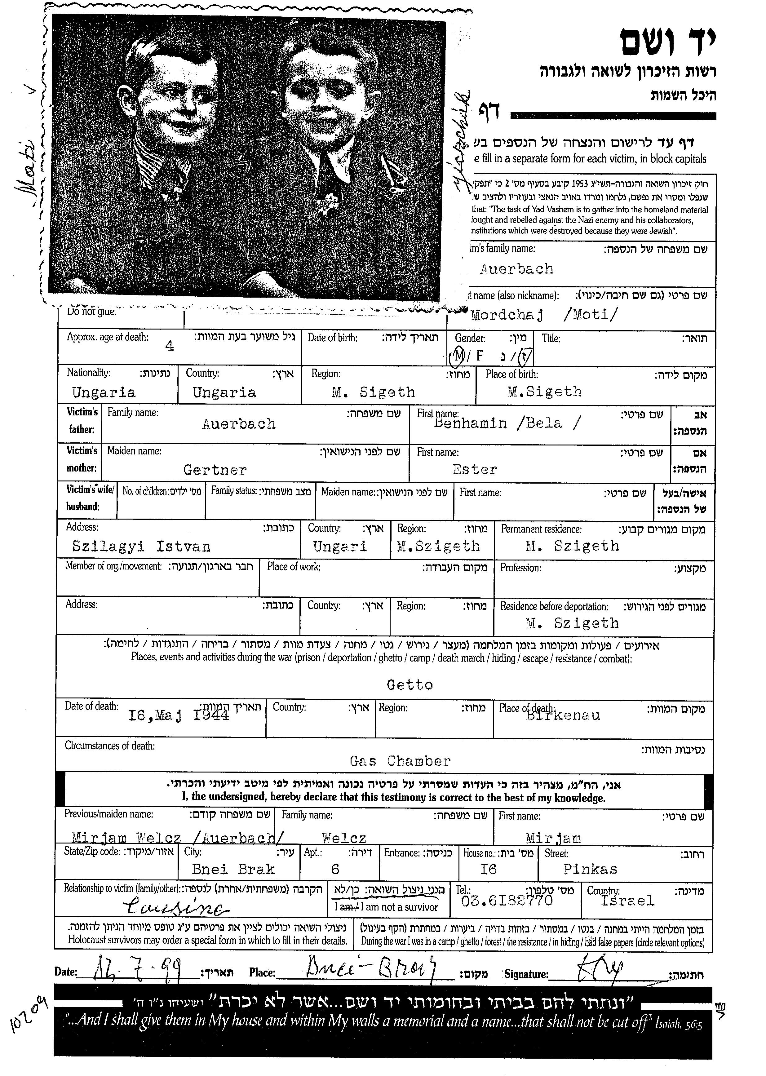 Mordchaj wurde in der Schoah ermordet. Todesort: Birkenau, Polen im Jahr 1944.