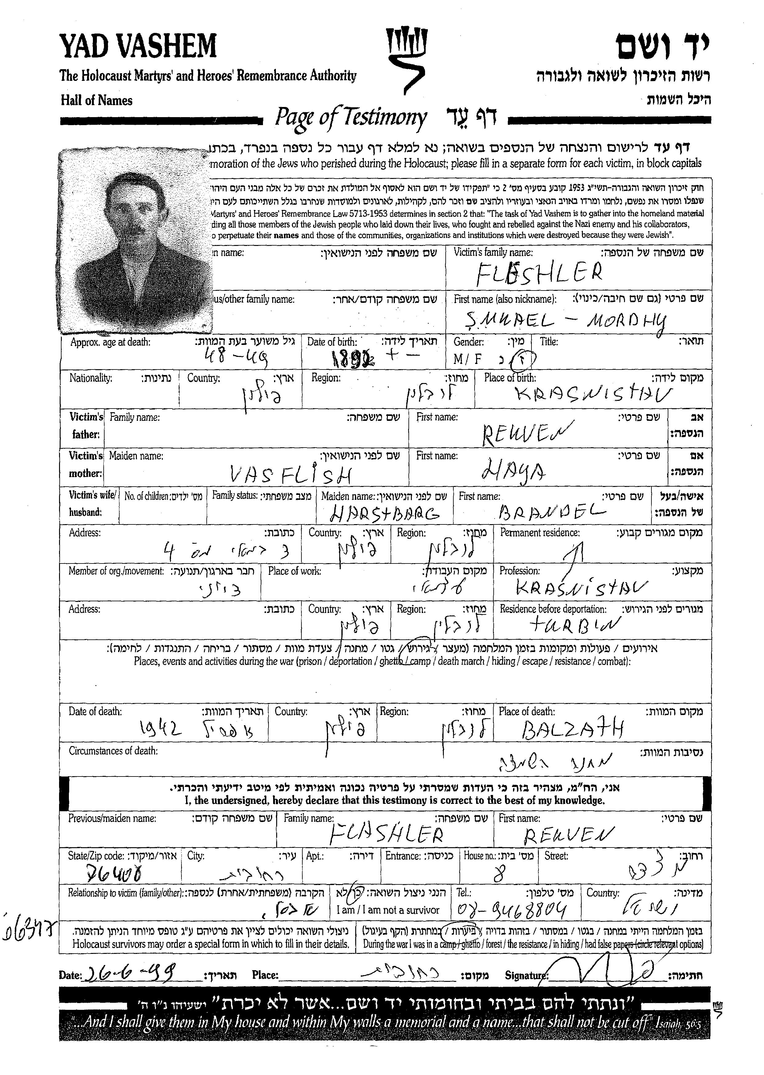 Fleshler | Smuael Mordchy | 1892 | Krasnystaw, Polen | Gedenkblatt |