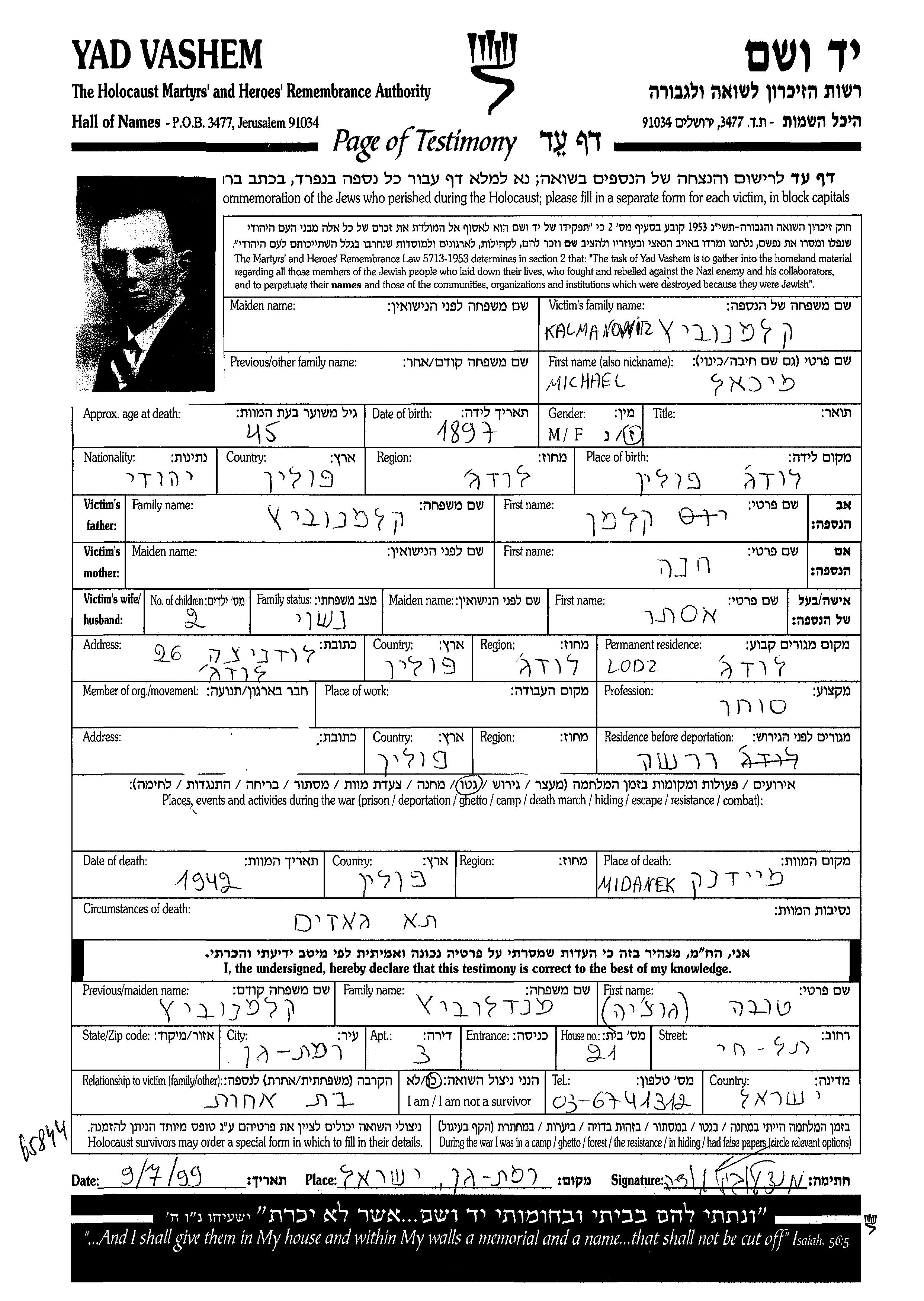 Kalmanowitz Michael 1897 Lodz, Polen Gedenkblatt