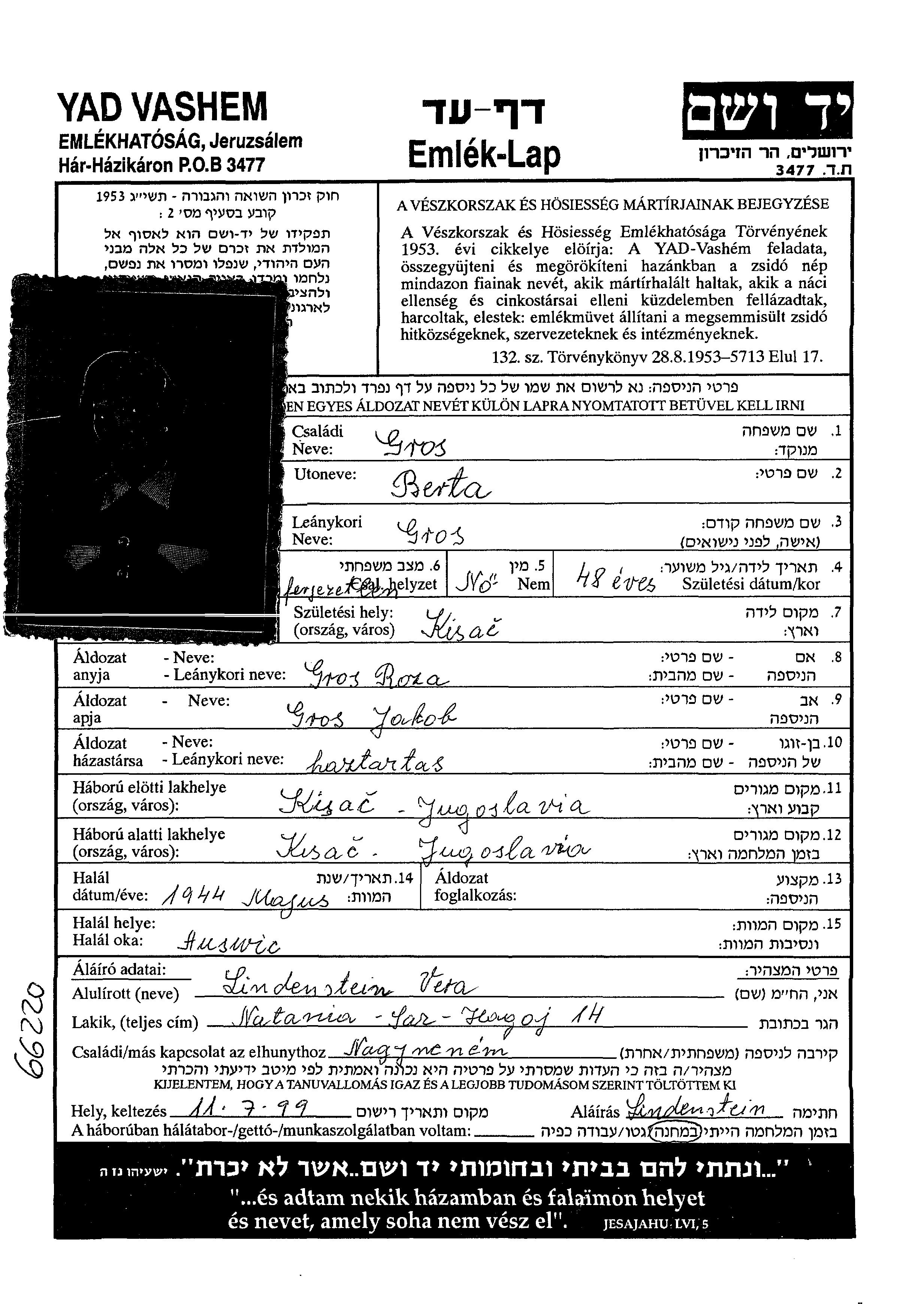 Berta wurde in der Schoah ermordet. Todesort: Auschwitz, Polen im Jahr 1944.