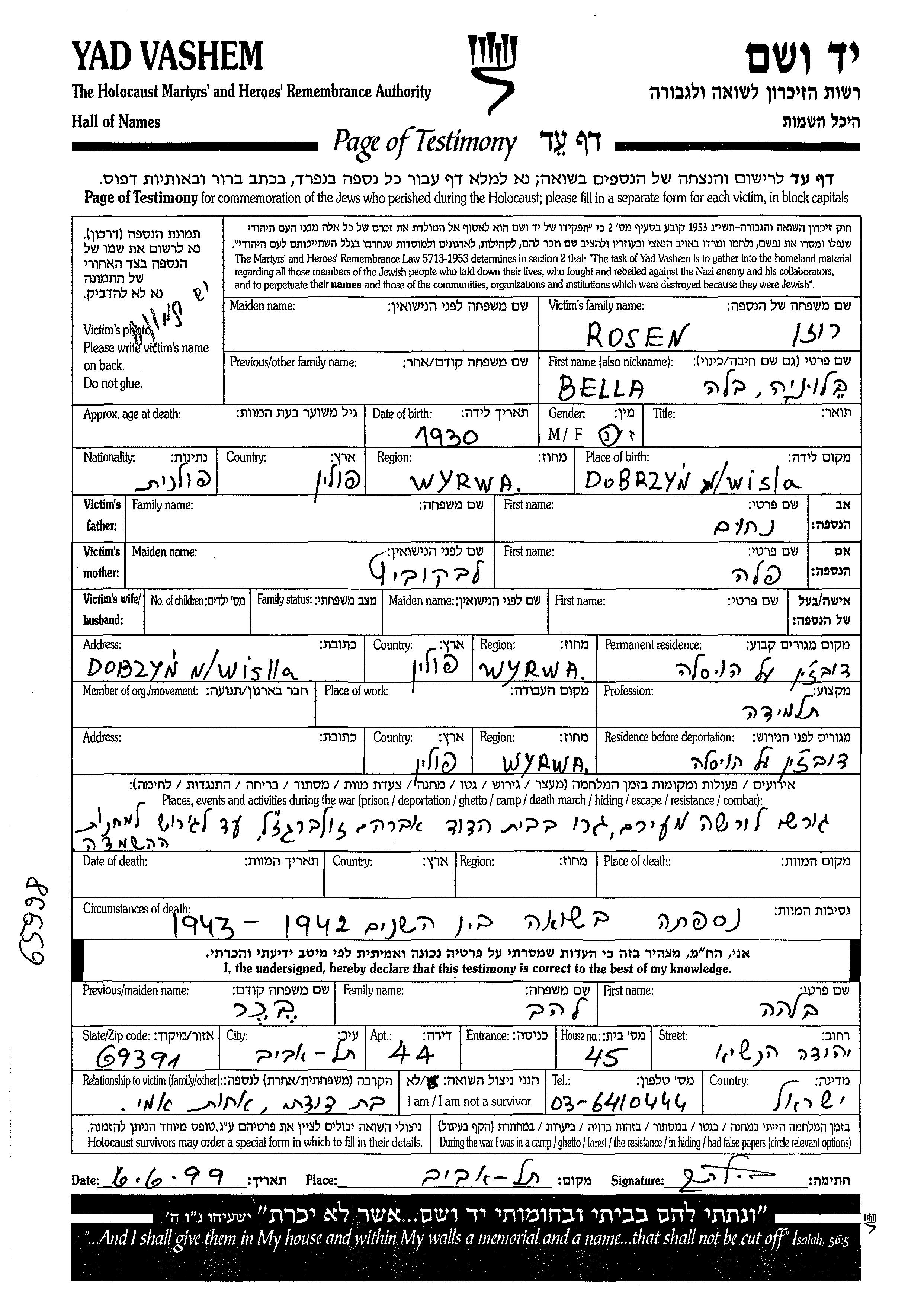 Bella Rosen wurde im Jahr 1930 in Dobrzyn nad Wisla, Polen geboren. Sie war Schüler/-in. Vor dem Zweiten Weltkrieg lebte sie in Dobrzyn nad Wisla, Polen.