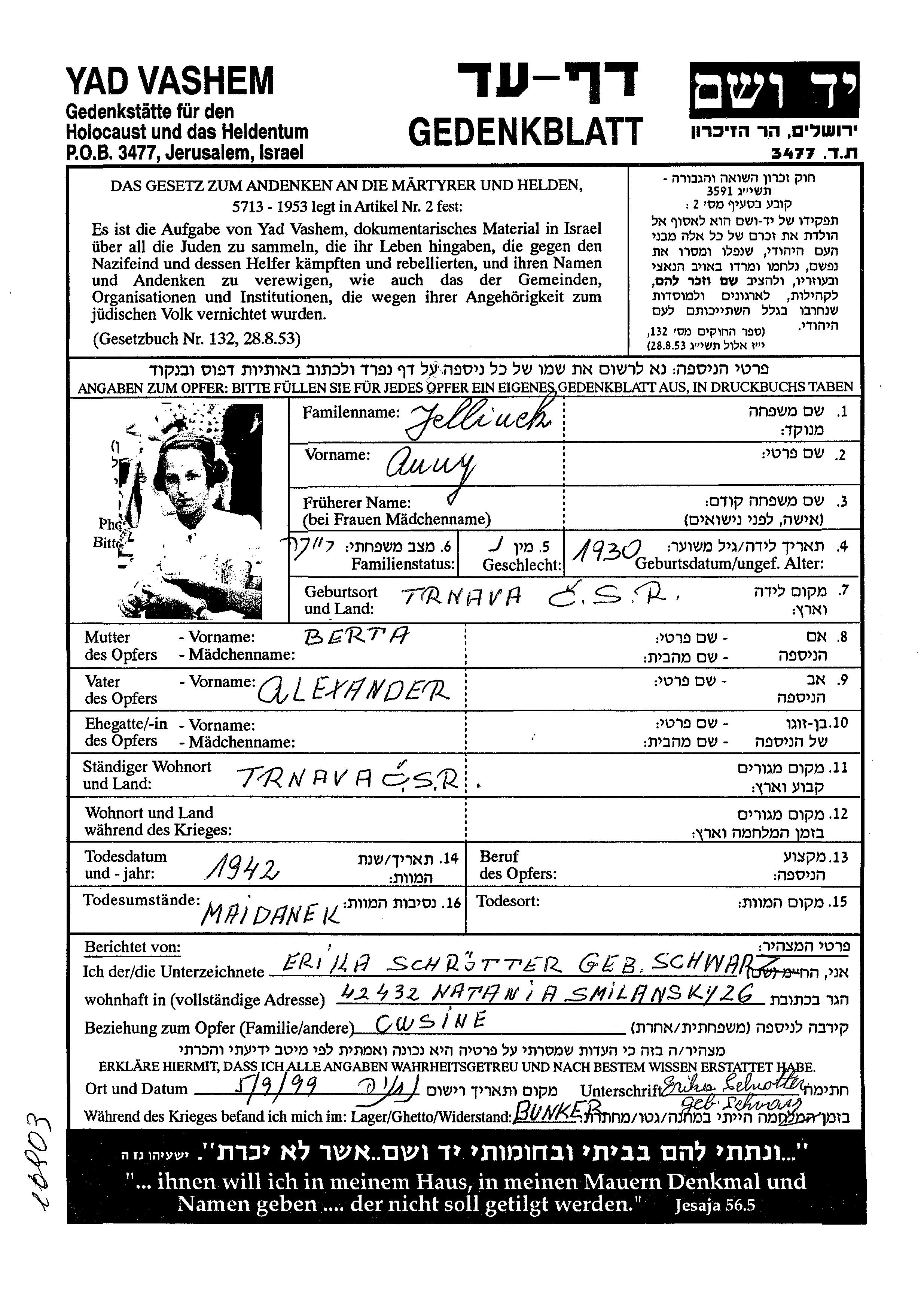Anny Jellinek wurde im Jahr 1930 in Trnava, Tschechoslowakei geboren. Vor dem Zweiten Weltkrieg lebte sie in Trnava, Tschechoslowakei.