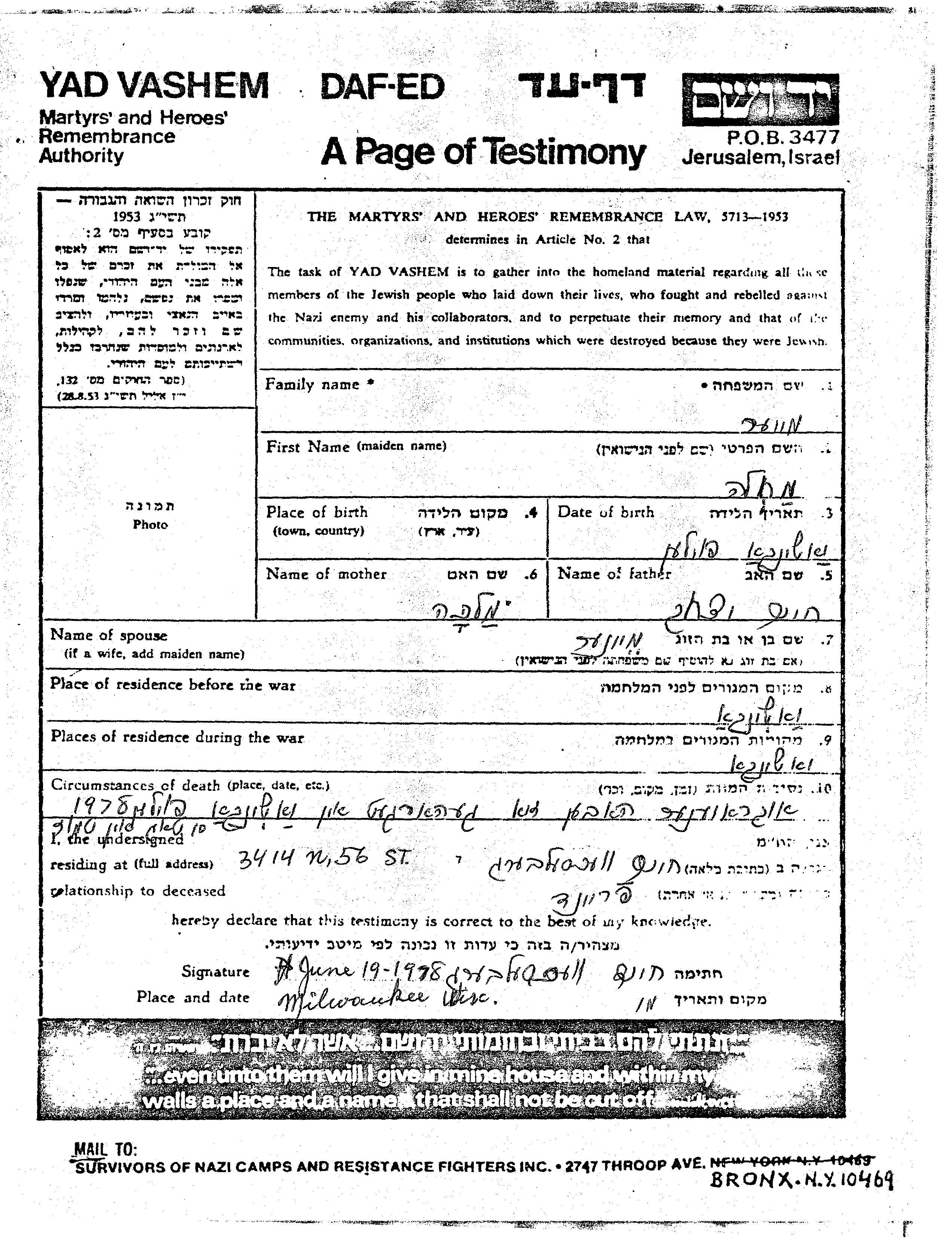 Makhla Meier wurde in Wiszenka, Polen geboren. Sie war die Tochter von Khaim Yitzkhak und Malka. Sie war mit Meiner Verheiratet. Vor dem Zweiten Weltkrieg lebte sie in Wiszenka, Polen. Während des Krieges war sie in Wiszenka, Polen.