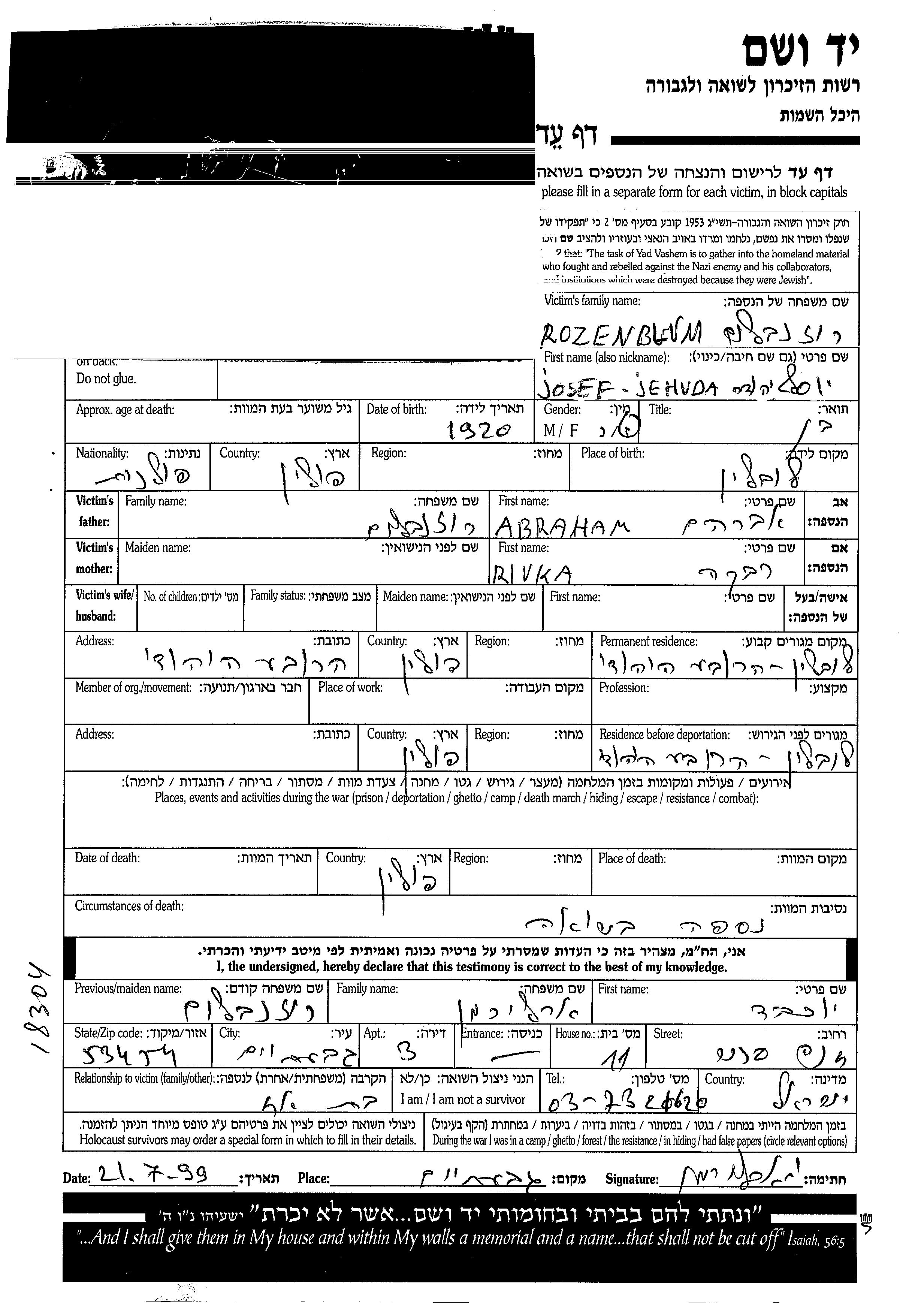 Rozenblum | Josef Jehuda | 1920 | Lublin, Polen | Gedenkblatt |