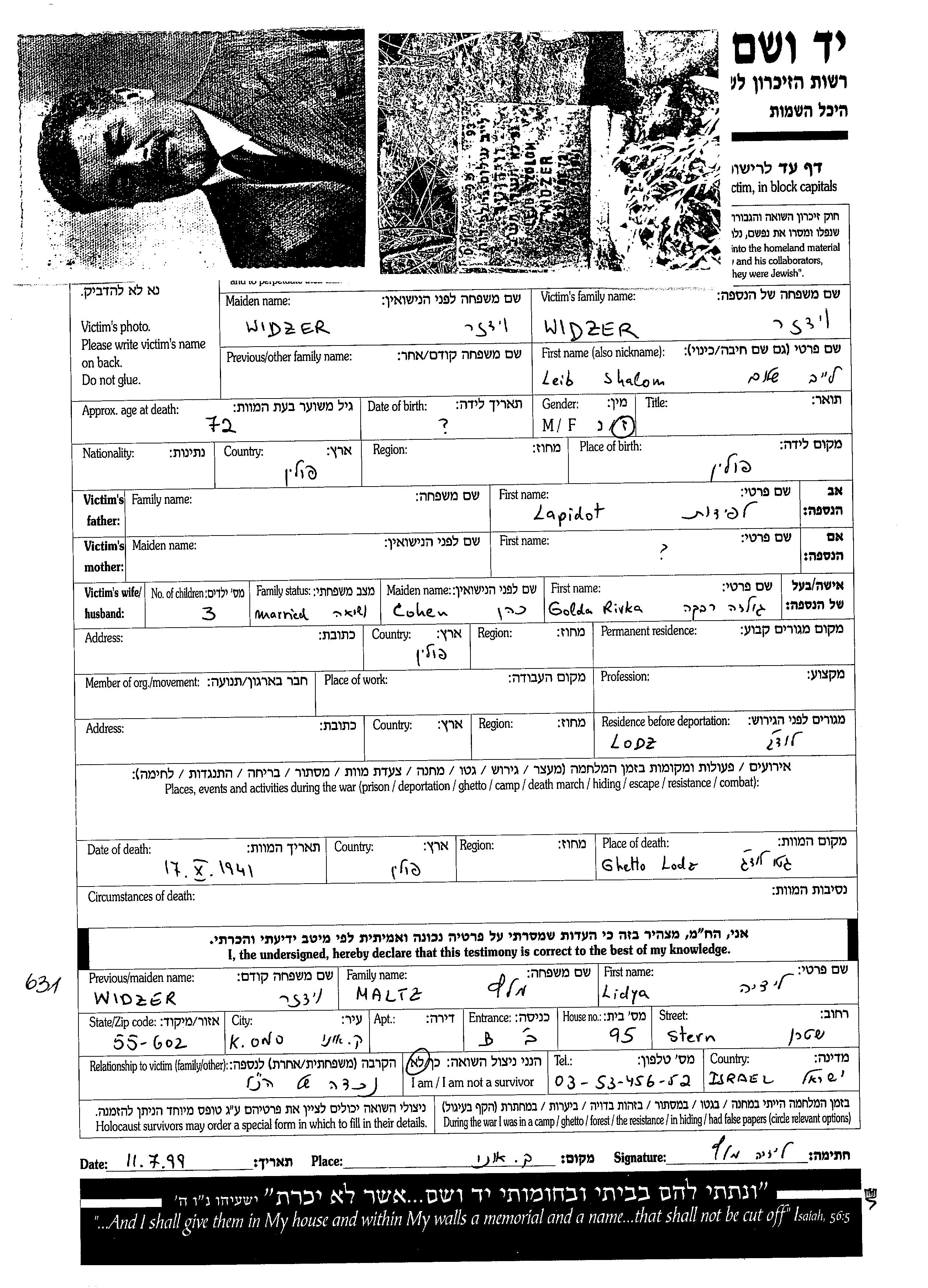 Leib Shalom wurde in der Schoah ermordet. Todesort: Lodz, Polen im Jahr 1941.